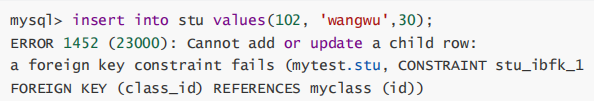 插入一个班级号为30的学生,因为没有这个班级,所以插入不成功