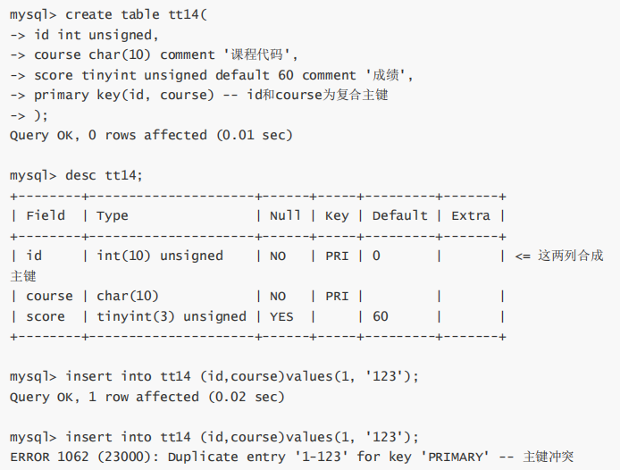 在创建表的时候,在所有字段之后,使用primary key(主键字段列表)来创建主键,如果有多个字段 作为主键,可以使用复合主键。