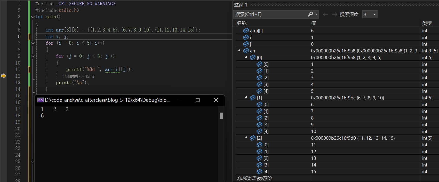我们回到arr数组中看我们要打印第一行的1、6、11是哪几个元素:分别为arr[0][0]、arr[1][0]、arr[2][0]。我们可以发现对于同一行来说,变化的是前一个下标,固定的是后一个下标。