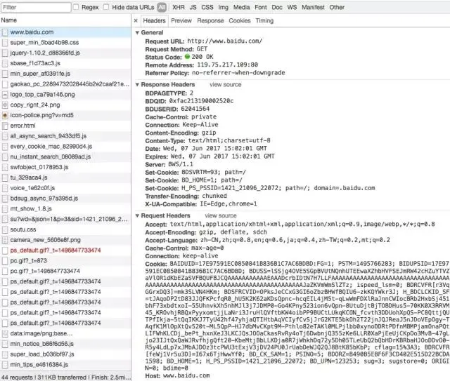 再继续往下看可以看到有一个 Response Headers 和一个 Request Headers,这分别代表响应头和请求头,请求头里面带有许多请求信息,例如浏览器标识、Cookies、Host 等信息,这是 Request 的一部分,服务器会根据请求头内的信息判断请求是否合法,进而作出对应的响应,返回 Response,那么在图中看到的 Response Headers 就是 Response 的一部分,例如其中包含了服务器的类型、文档类型、日期等信息,浏览器接受到 Response 后,会解析响应内容,进而呈现网页内容。