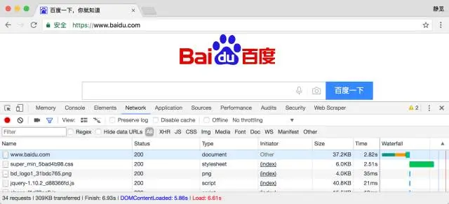 打开 Chrome 浏览器,右键点击检查,或按下快捷键 F12 即可打开浏览器的开发者工具,我们在这里访问百度:http://www.baidu.com/,输入该 URL,敲击回车访问这个页面,观察一下在这个过程中发生了怎样的网络请求,这时我们可以看到在 Network 页面的下方出现了一个个的条目,那么这一个条目就代表一次发送 Request 和接收 Response 的过程,如图所示: