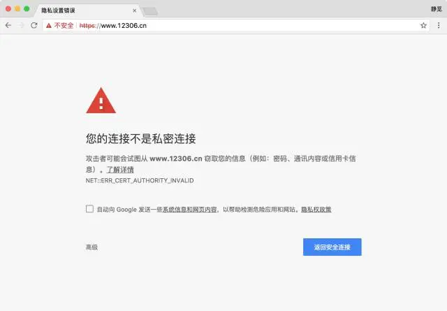 而某些网站虽然使用了 HTTPS 协议还是会被浏览器提示不安全,例如我们在 Chrome 浏览器里面打开 12306,链接为:https://www.12306.cn/,这时浏览器就会提示“您的连接不是私密连接”这样的话,如图所示:
