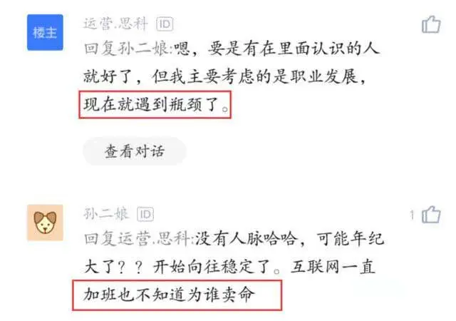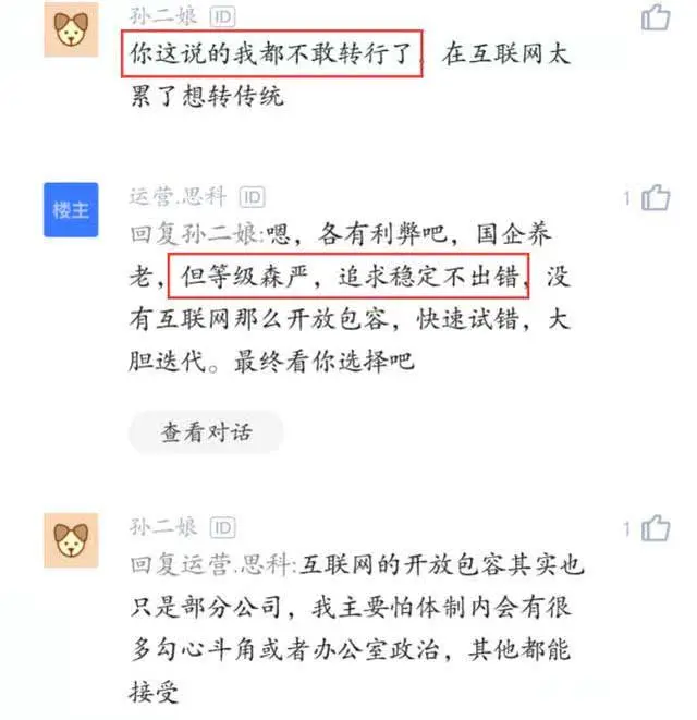 而这个程序员后来补充:其实自己也想去国企,要是在里面认识人就好了,但是主要考虑的是职业发展,遇到瓶颈了。而国企的这个工作环境以及技术或许不能满足自己要求,给再高的工资也并不能让自己未来发展的更好,还不如留在互联网公司加班呢!