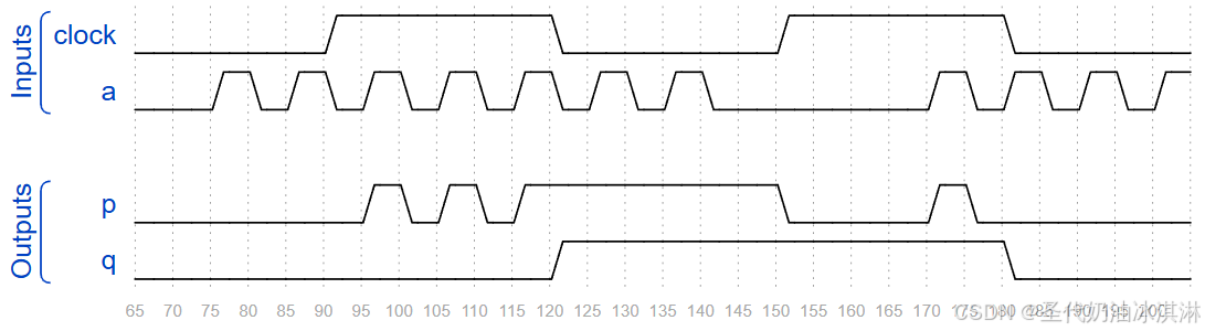 q = p;//看波形,下降沿出现的clk,q数值就和变到p相同了,没有时延,所以是阻塞赋值“=”。