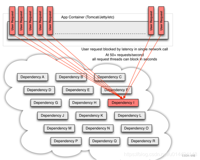 在电影里面经常出现的场景,在冰山雪地不要大声呼喊,因为声音的震动会导致雪球的滑落,然后引起连锁反应导致整个雪山的崩塌这就是生活中的雪崩。在微服务里面也是一样,服务的调用非常复杂的 ,一个请求往往需要很多的微服务共同完成,可能会形成很长的服务调用链,在整个服务调用链中,某一个服务发生故障会导致调用它的服务跟着异常,然后导致整个调用链调用的异常,甚至导致整个微服务瘫痪 , --- 这就是雪崩效应。如下图: