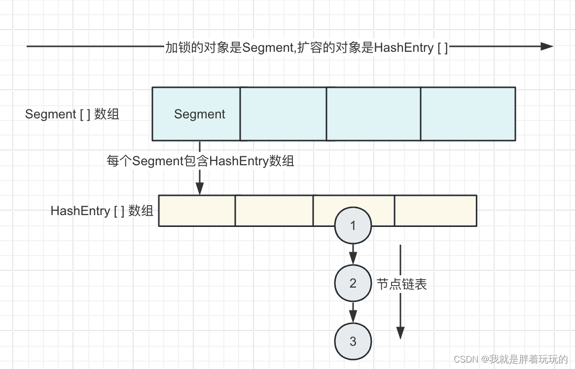 JDK7 ConcurrentHashMap JDK7 中的 ConcurrentHashMap 通过分段锁和哈希表的组合实现了高效的并发操作。每个 Segment 独立进行操作,通过减小锁的粒度来提高并发性能。下节我们来看JDK8中对ConcurrentHashMap又有哪些改进!!!