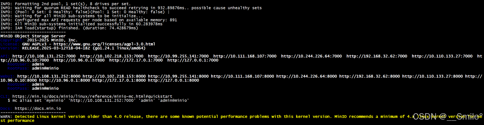 3、启动扩容后的 minio 集群,在四台机器上都执行这个启动脚本