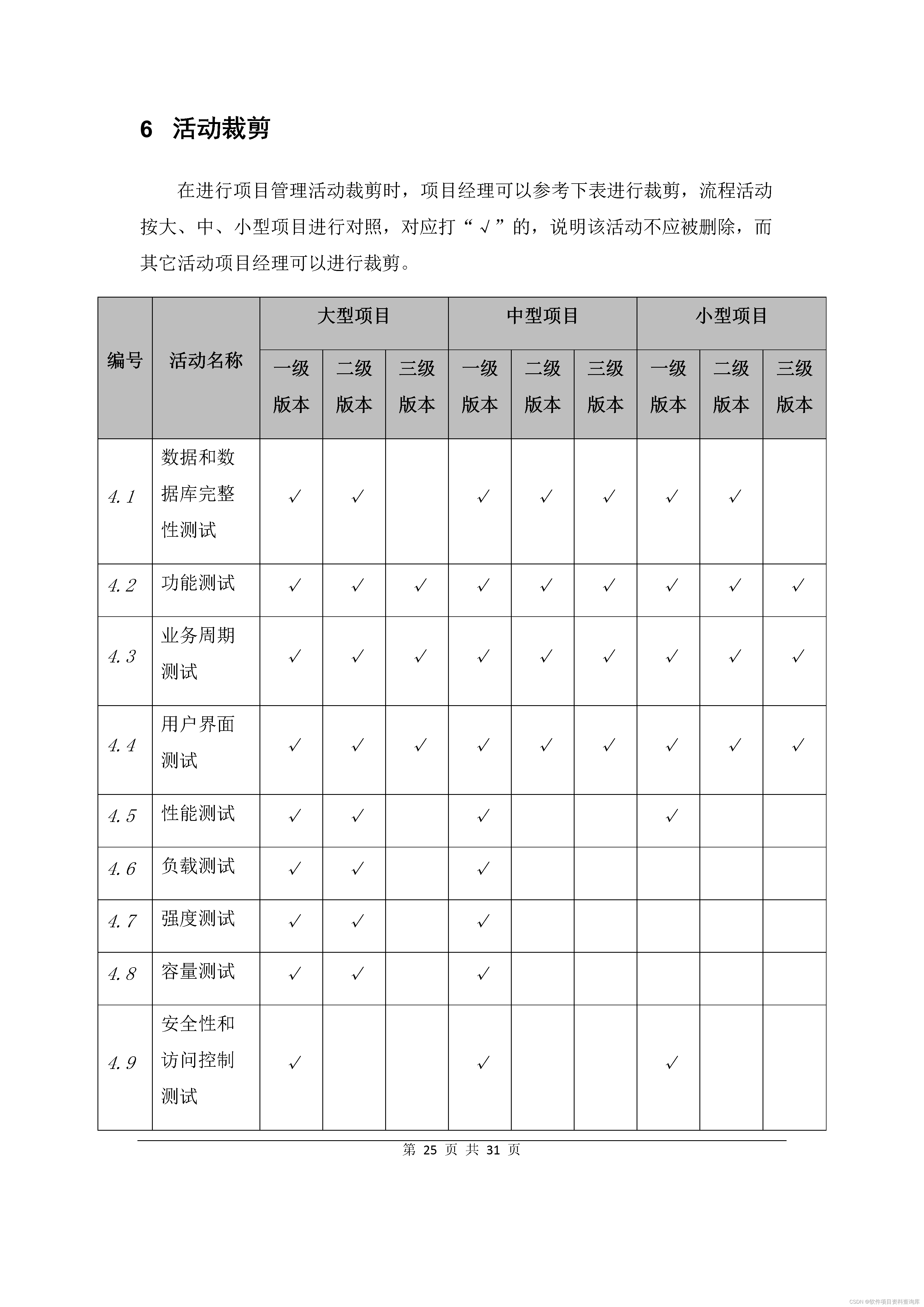 工作安排任务书,可行性分析报告,立项申请审批表,产品需求规格说明书,需求调研计划,用户需求调查单,用户需求说明书,概要设计说明书,技术解决方案,数据库设计说明书,详细设计说明书,单元测试报告,总体测试计划,单元测试计划,产品集成计划,集成测试报告,集成测试计划,系统测试报告,产品交接验收单,验收报告,验收测试报告,压力测试报告,项目总结报告,立项结项审批表,成本估算表,项目计划,项目周报月报,风险管理计划,质量保证措施,项目甘特图,项目管理工具,操作手册,接口设计文档,软件实施方案,运维方案,安全检测报告,投标响应文件,开工申请表,开工报告,概要设计检查表,详细设计检查表,需求规格说明书检查表,需求确认表,系统代码编写规范,软件项目质量保证措施,软件部署方案,试运行方案,培训计划方案,软件系统功能检查表,工程试运行问题报告,软件合同,资质评审材料,信息安全相关文档等。