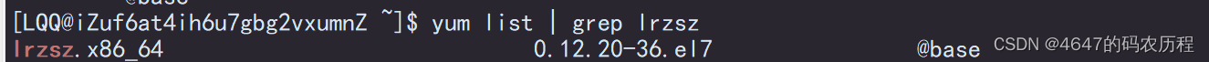 这里的 lrzsz 是windows 和 linux 进行文件互传的命令。这里.x86 _ 64表示这个安装包只能在32位或64位的机器(cpu)上跑,其他的机器是无法运行的,我们可以用uname - a 指令来查看当前机器是64位还是32位的。除了硬件不同会影响安装包的正常运行外,不同的操作系统也会对安装包的正常运行有影响。这里的 0.12.20-36 表示的是版本,el7 表示具体的操作系统的版本(这里我用的是centos 7)。这里的@base 表明的是该安装包的来源。