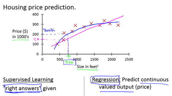 参考视频: 1 - 3 - Supervised Learning (12 min).mkv在这段视频中,我要定义可能是最常见一种机器学习问题:那就是监督学习。我将在后面正式定义监督学习。我们用一个例子介绍什么是监督学习把正式的定义放在后面介绍。假如说你想预测房价。前阵子,一个学生从波特兰俄勒冈州的研究所收集了一些房价的数据。你把这些数据画出来,看起来是这个样子:**横轴表示房子的面积,单位是平方英尺,纵轴表示房价,单位是千美元。