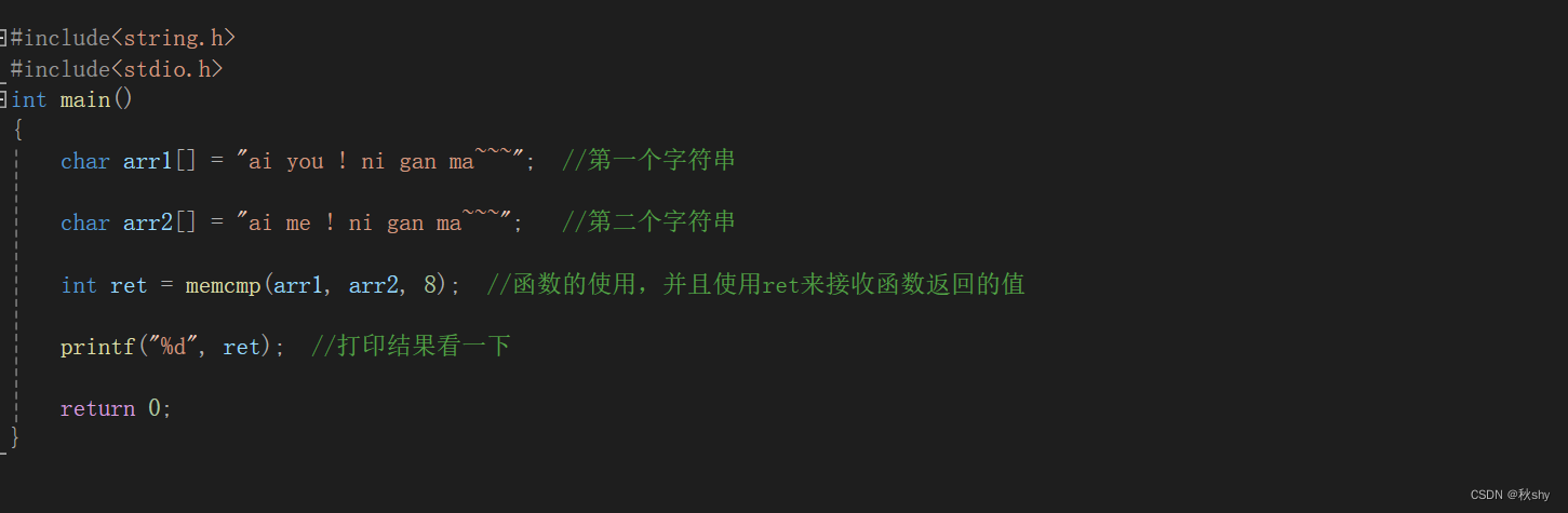 注:函数使用的时候第三个参数是你想要比较的字节数(作者这里随便写了个8,因为一个char类型为一个字节,所以这里表明比较前8个字节,读者可以根据自己想比较的字节数来填写)