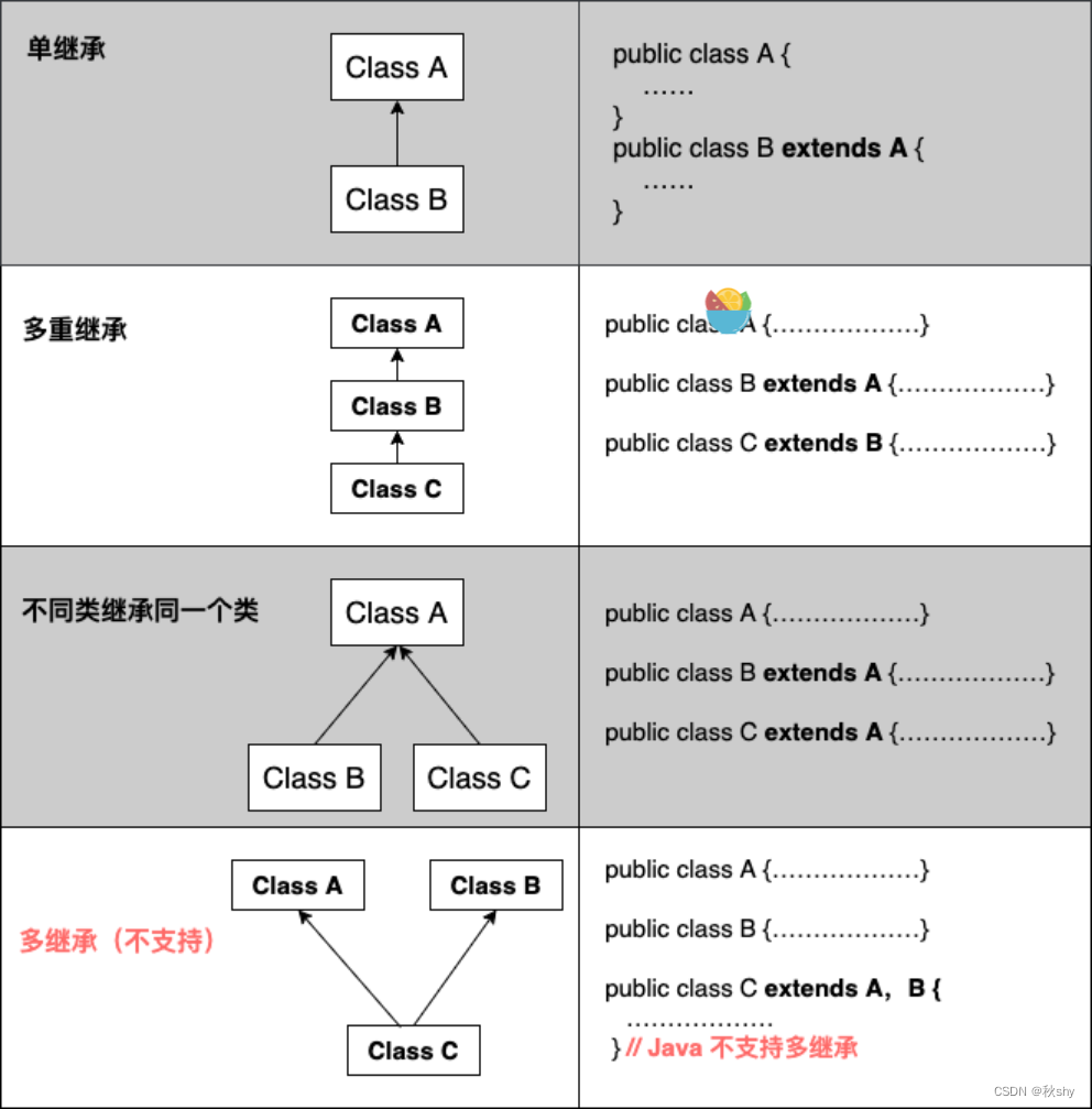 (4)Java 的继承是单继承,但是可以多重继承,单继承就是一个子类只能继承一个父类,多重继承就是,例如 B 类继承 A 类,C 类继承 B 类,所以按照关系就是 B 类是 C 类的父类,A 类是 B 类的父类.。
