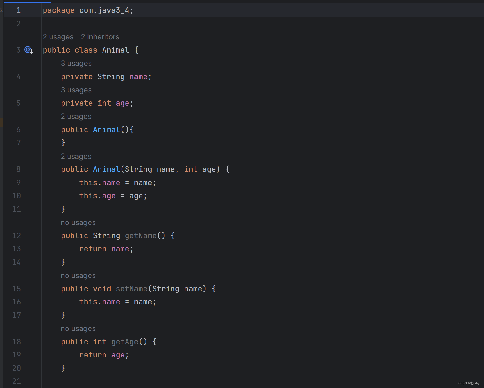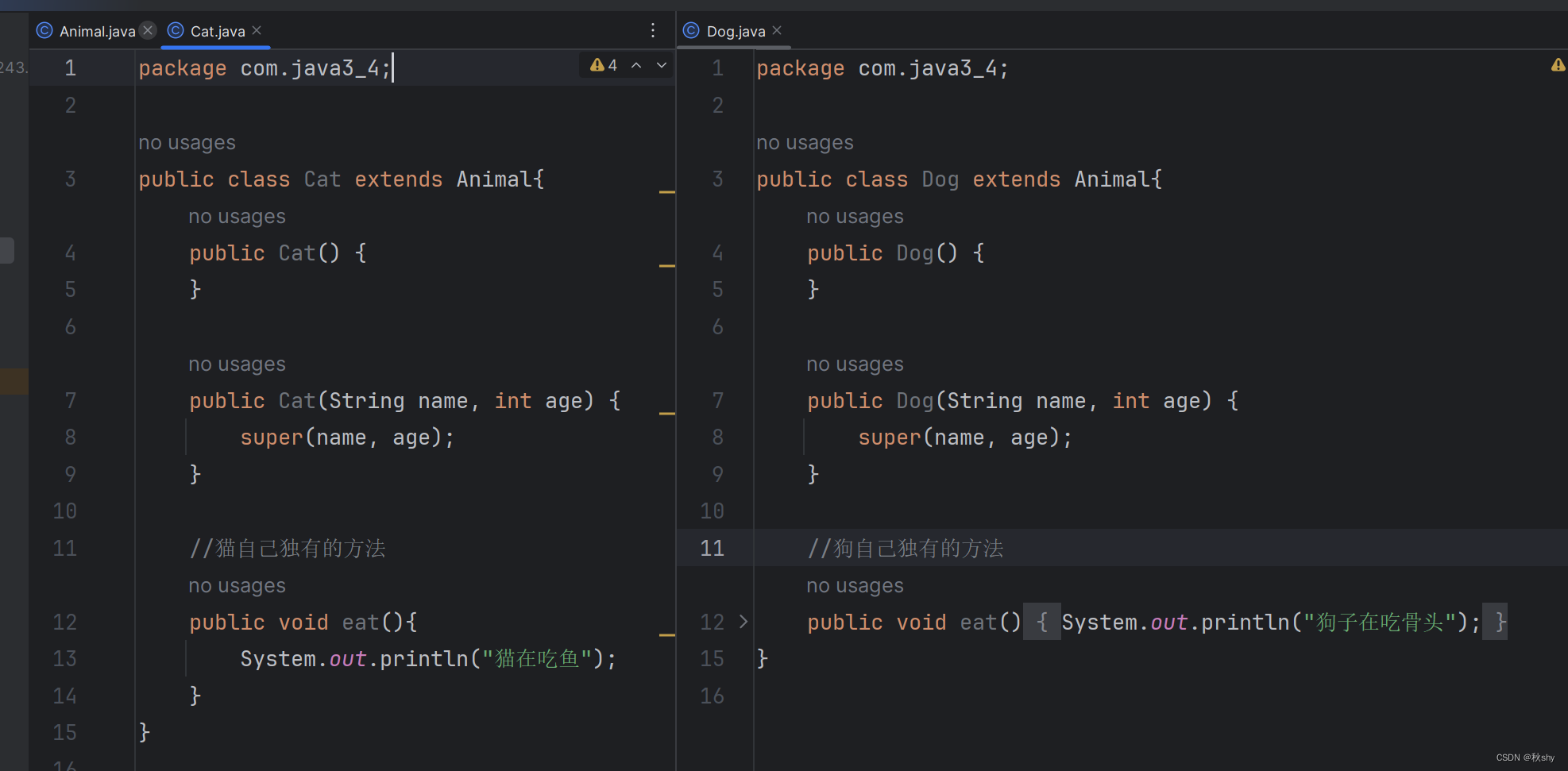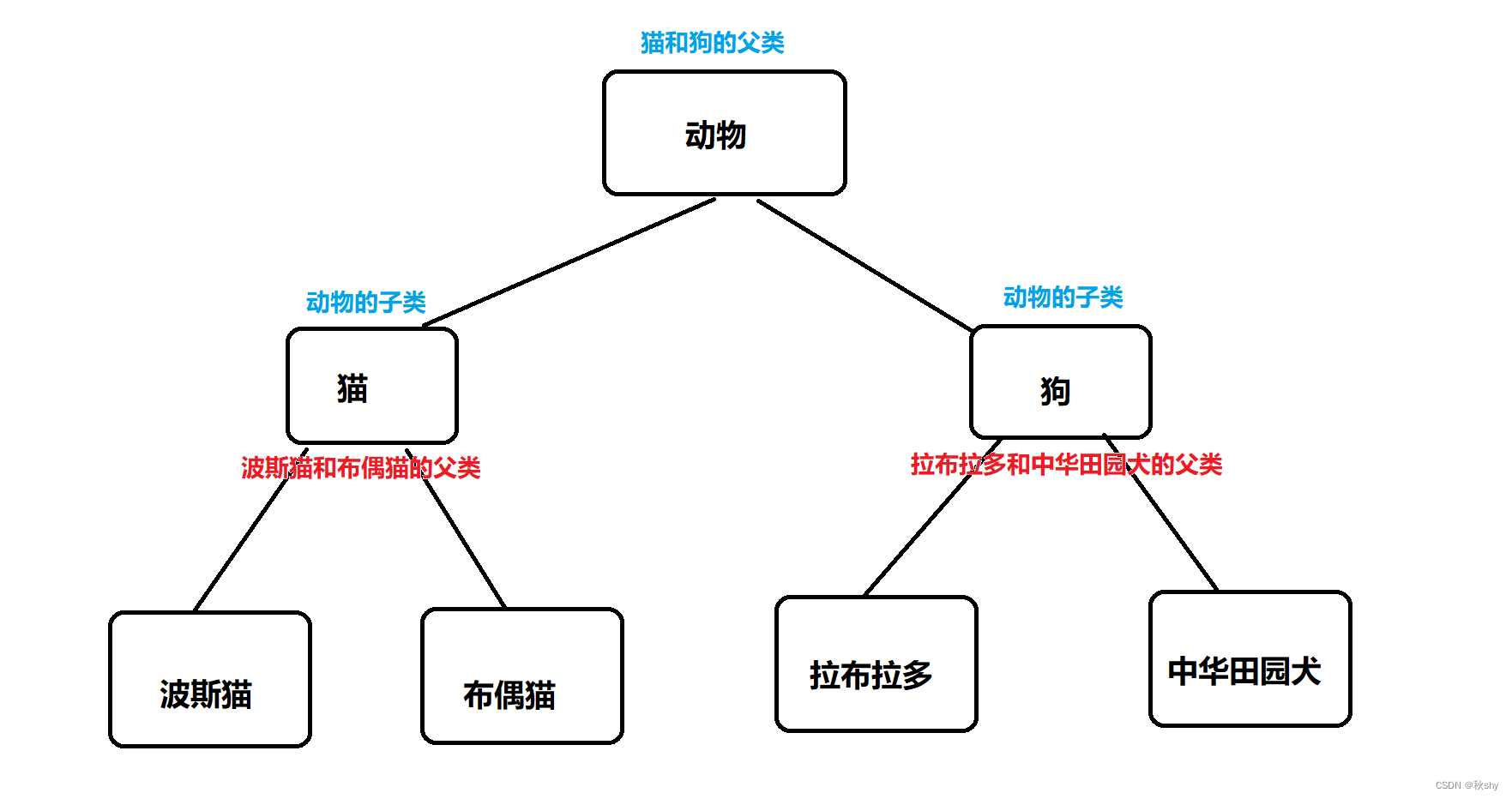 我们将猫(Cat)和狗(Dog)共有的属性定义在动物类(Animal)中,将猫狗继承父类动物类,这样子类(猫狗)就都有了名字和年龄的属性,但是猫狗自己特有的属性单独写到自己的类中,这样就完成了代码的简化。如果不使用继承,就会导致代码量大且臃肿,而且维护性不高(维护性主要是后期需要修改的时候,就需要修改很多的代码,容易出错),所以要从根本上解决这两段代码的问题,就需要继承,将两段代码中相同的部分提取出来组成 一个父类。