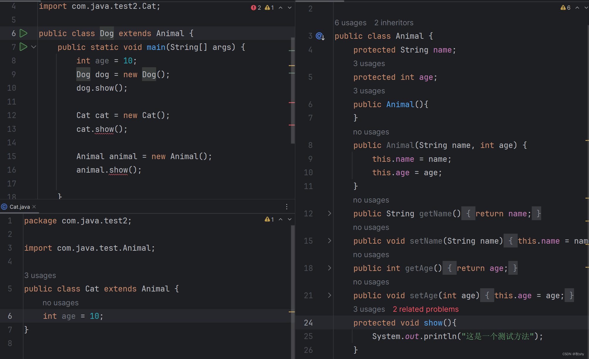 从上图中,我们可以看到两个子类和父类都不同包,但是两个子类却同包,在该子类(Dog)的自己的作用域中创建自己的对象调用protected修饰的变量是可以的,但是Cat类在别人的作用域里面创建对象调用不了protected修饰的变量,并且也不可以创建父类的对象调用父类自己的方法。