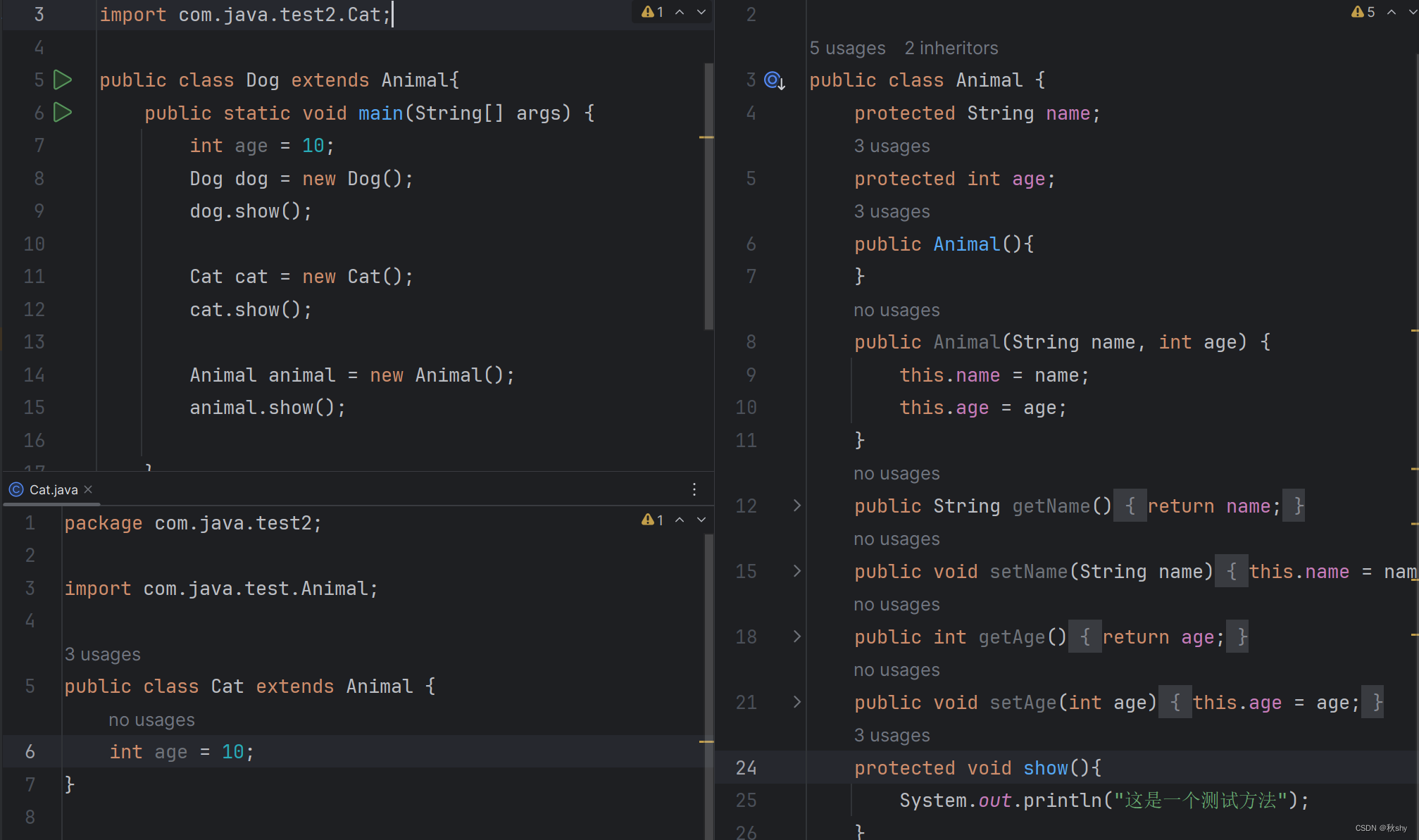 从上图中,我们可以看到两个子类和父类都不同包,在该子类(Dog)的自己的作用域中创建自己的对象调用protected修饰的变量是可以的,但是Cat类在别人的作用域里面创建对象调用不了protected修饰的变量,并且也不可以创建父类的对象调用父类自己的方法。