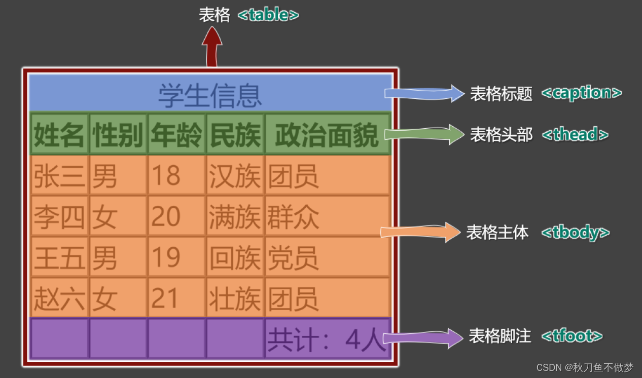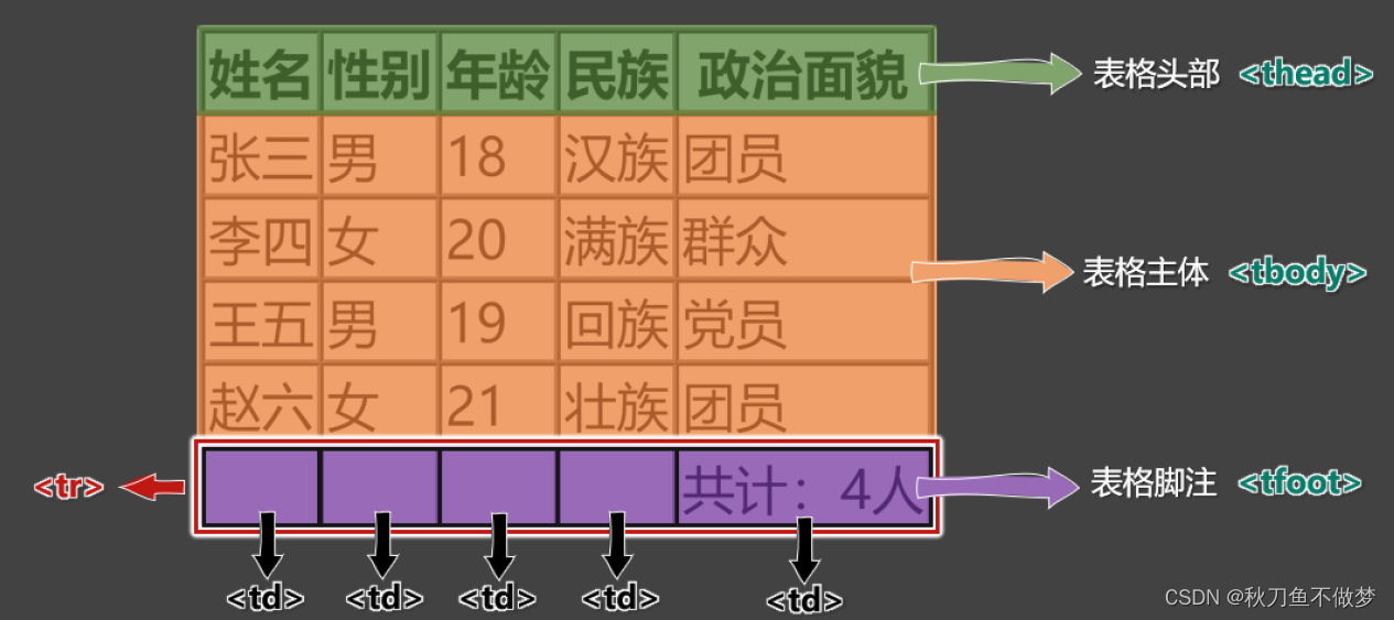 4. tbody :用于创建表格主体