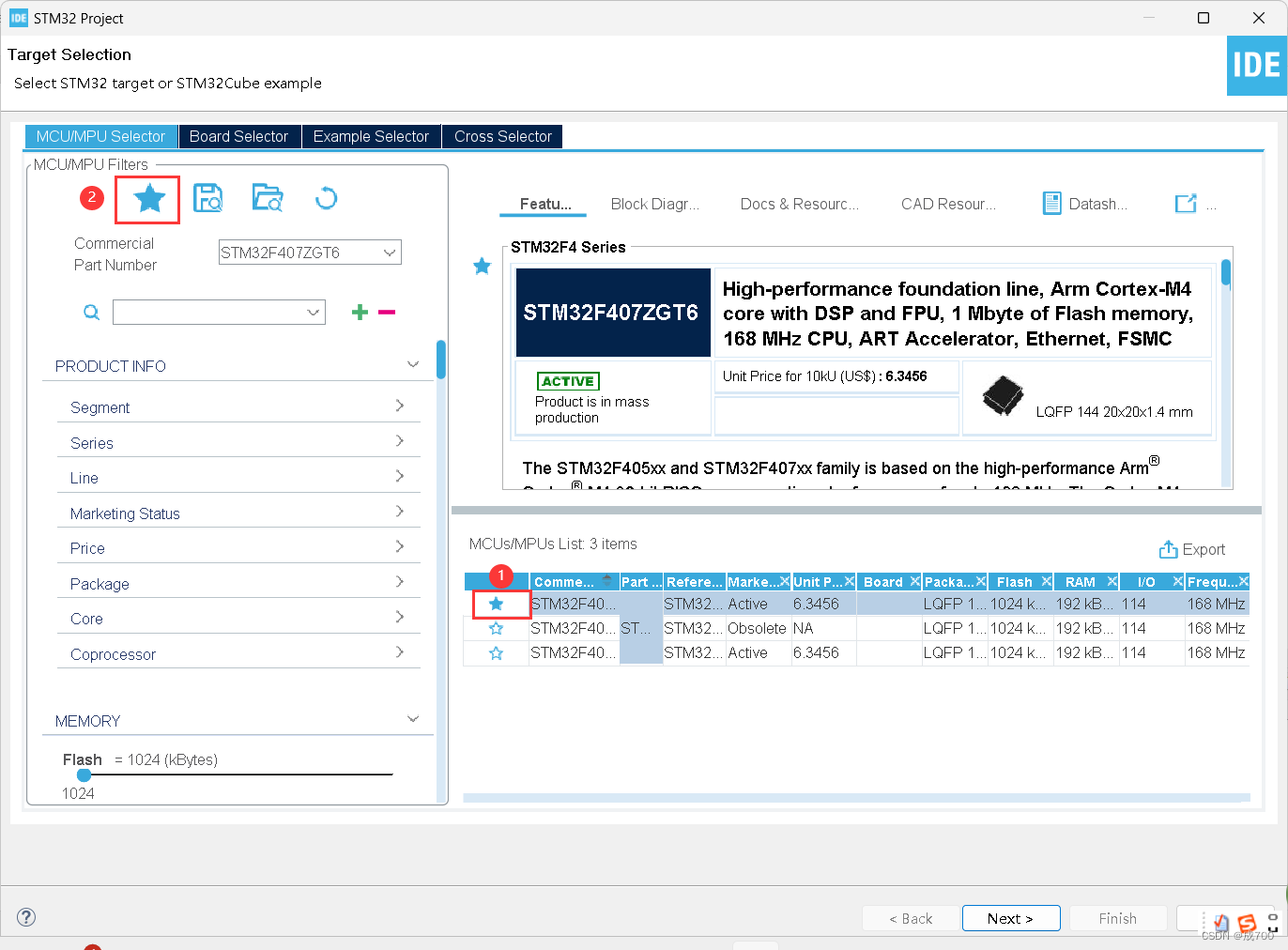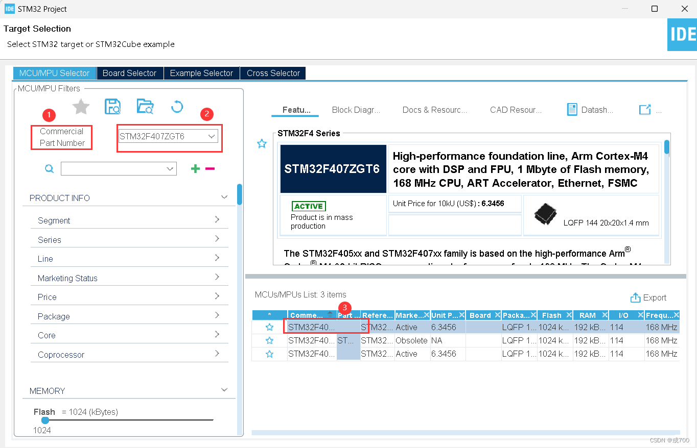 2.芯片选择,在 CommercialPart Number 处进行检索,输入自己使用的芯片,在右侧选择第一个(一般来说)。