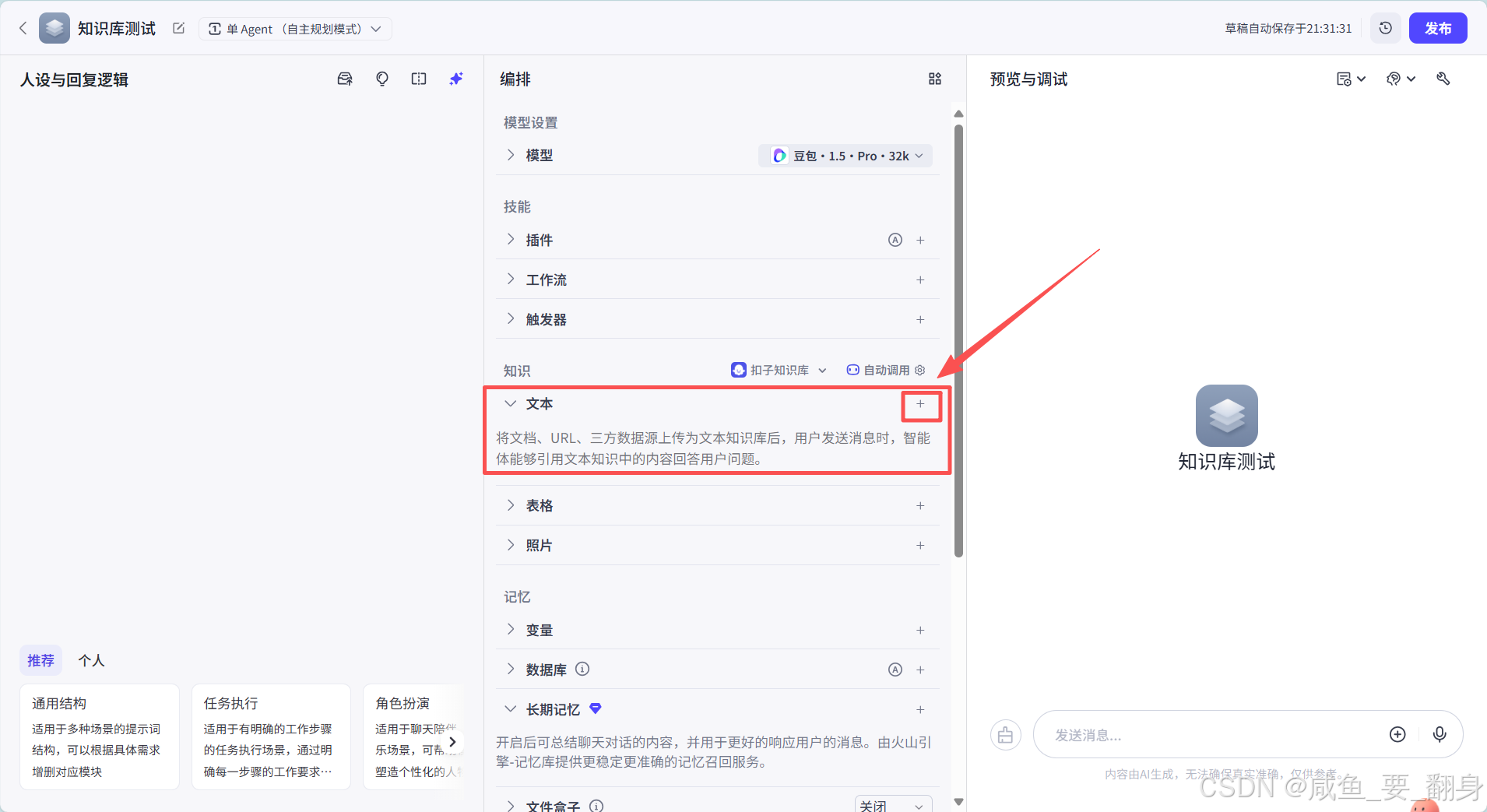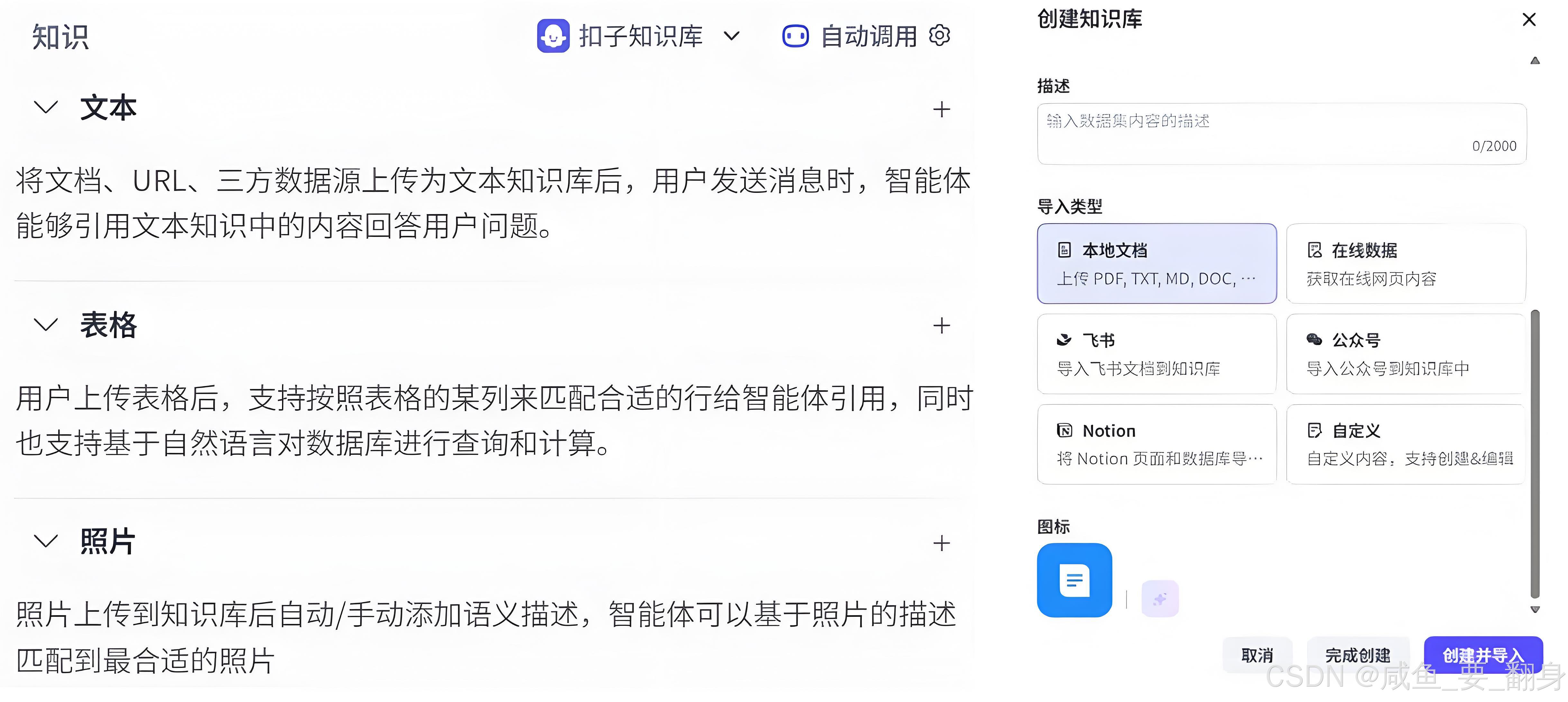 功能概述:支持用户在Coze平台界面上直接手动输入文本或表格数据,实现知识的即时补充。