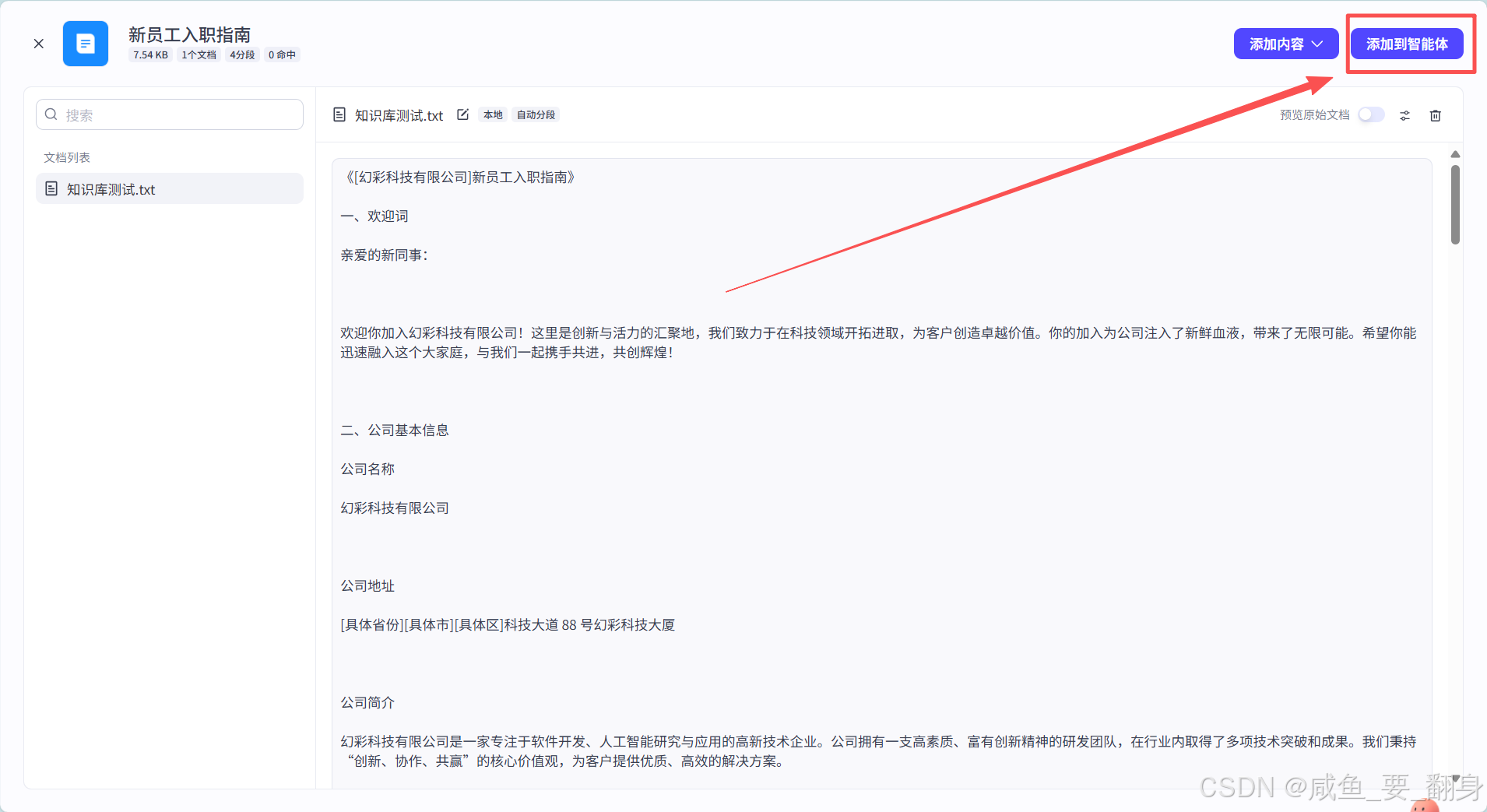 对于本地数据,用户则可以通过上传本地文件(这个例子已经在上面的新员工入职指南中演示了,这里就不再演示了,可以翻上去看看)的方式,将已有的知识资源快速导入至知识库中。在导入过程中,知识库会自动对文本数据进行预处理,如分词、去重、格式转换等,以确保数据的规范性与可用性。