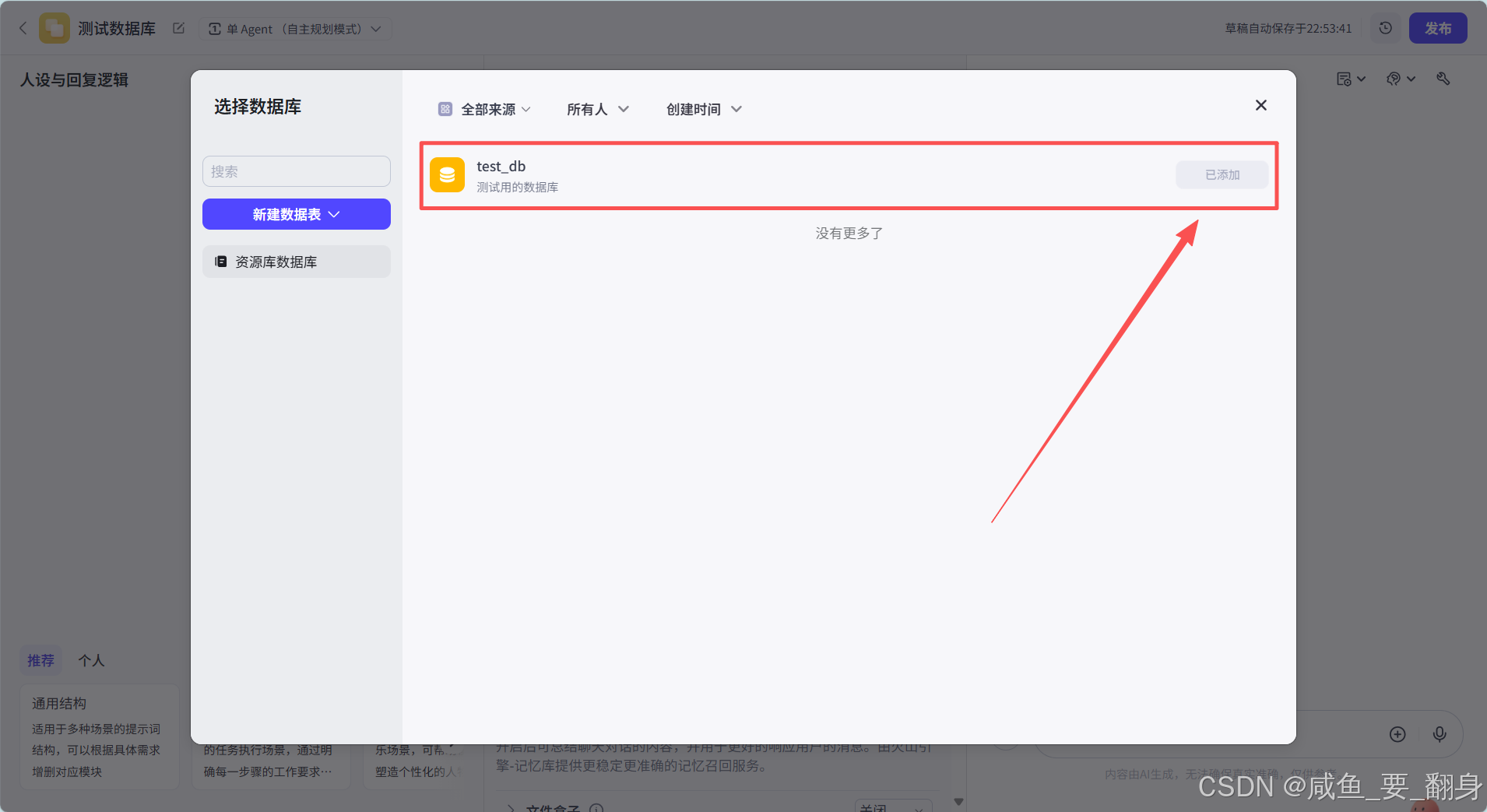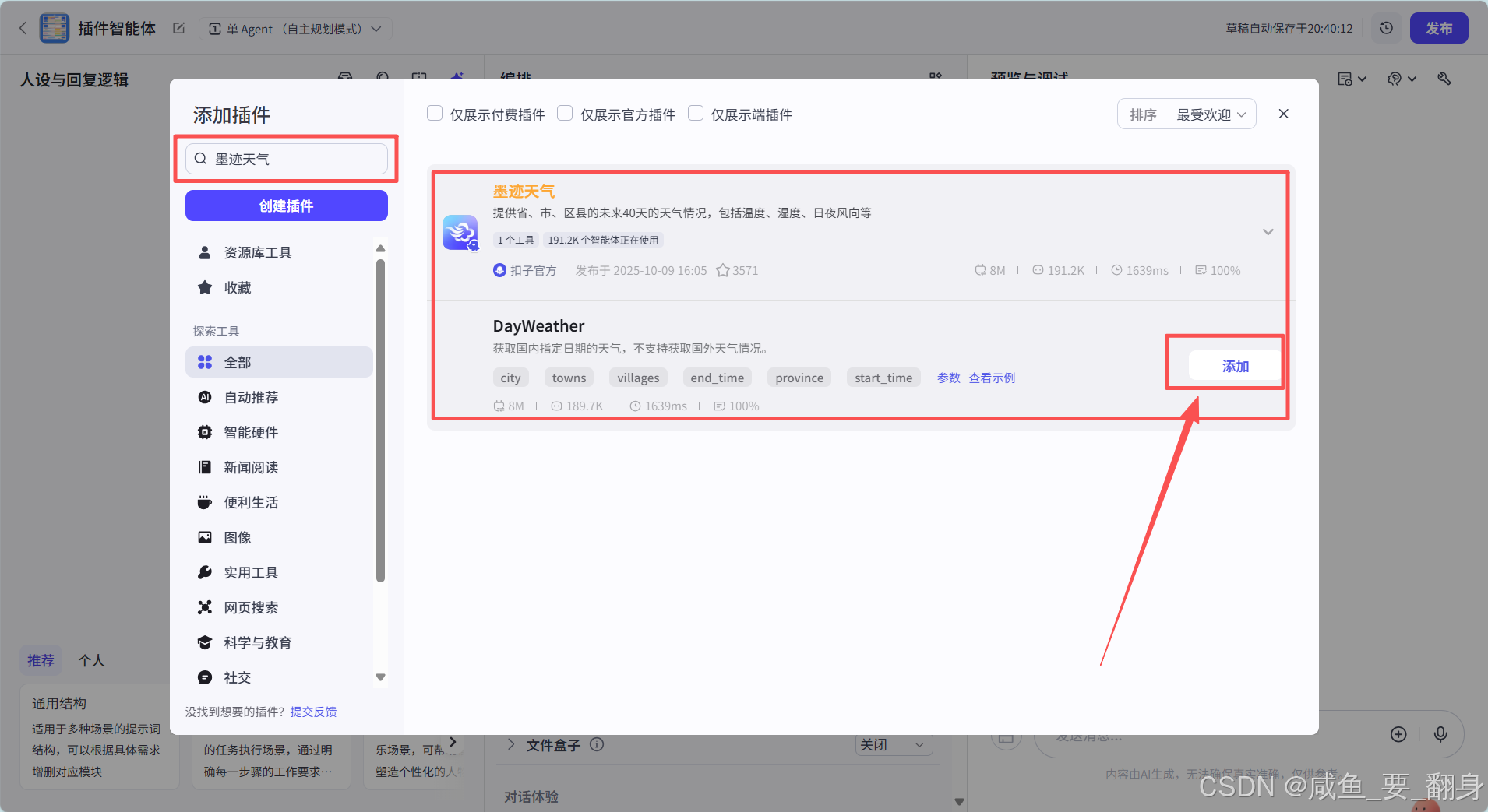 确认添加:选中目标插件后点击“添加”,系统会自动将其集成到智能体技能库中,无需额外的代码开发,大大简化了插件添加的流程。