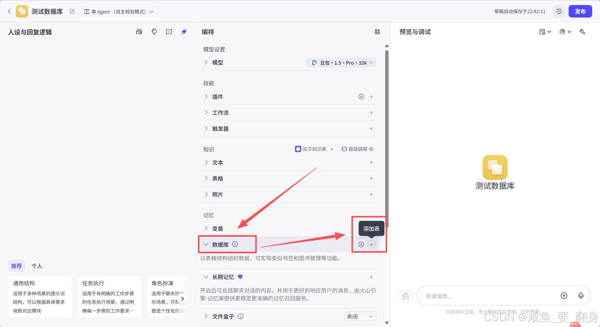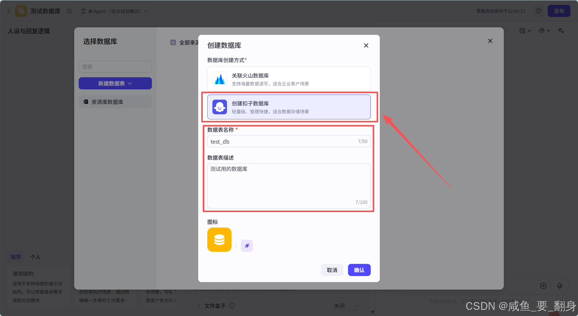 在Coze平台中,数据库主要分为两种类型:火山数据库和扣子数据库。鉴于我们的数据量相对较小,且扣子数据库在轻量级应用中表现出色,因此我们选择扣子数据库作为存储方案。
