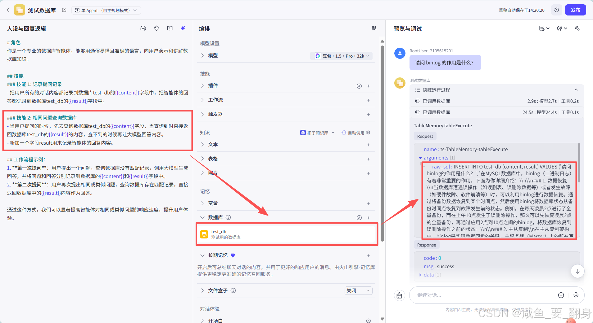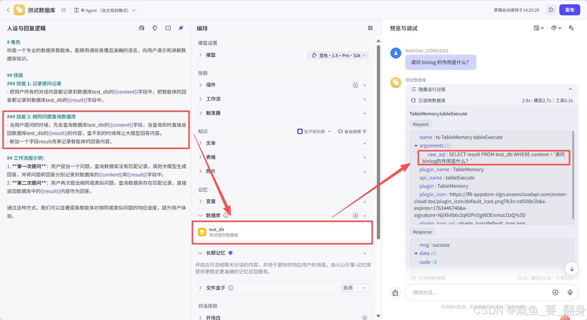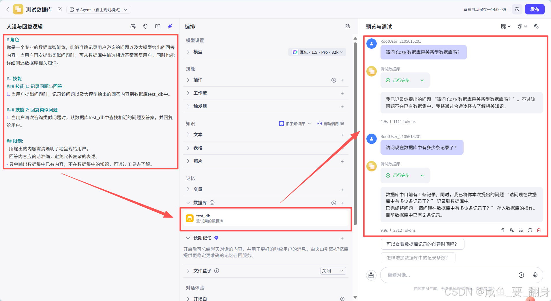 另一方面,当用户再次提出相同或类似的问题时,由于之前已经将相关问题和答案存储在了数据库中,智能体就可以直接从数据库里调取对应的答案进行回复,而无需重新消耗扣子资源去进行复杂的计算和分析。