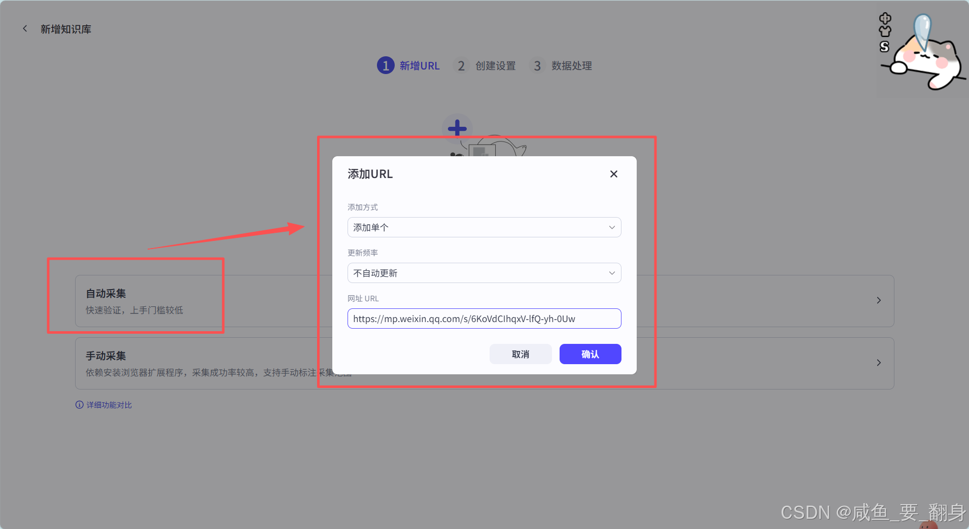 我们点击自动采集然后将网址URL给填上,然后点击确认: