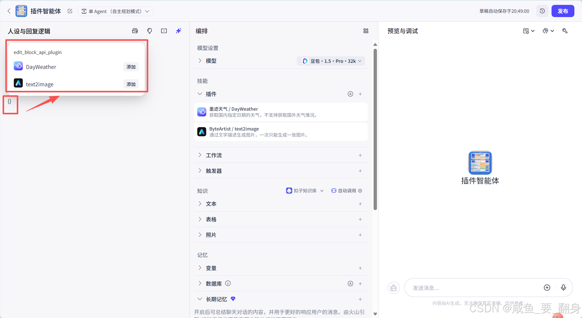 要想准确地在智能体中调用插件,除了需要明确的提示词外,还需要搞清楚插件的参数,确保调用插件时传参正确。我们想要调用插件时,直接在提示词中输入{},也就是大括号,然后不松开Shift键,在弹出来的相关插件中选择对应的插件(前提我们得选添加到插件列表中):