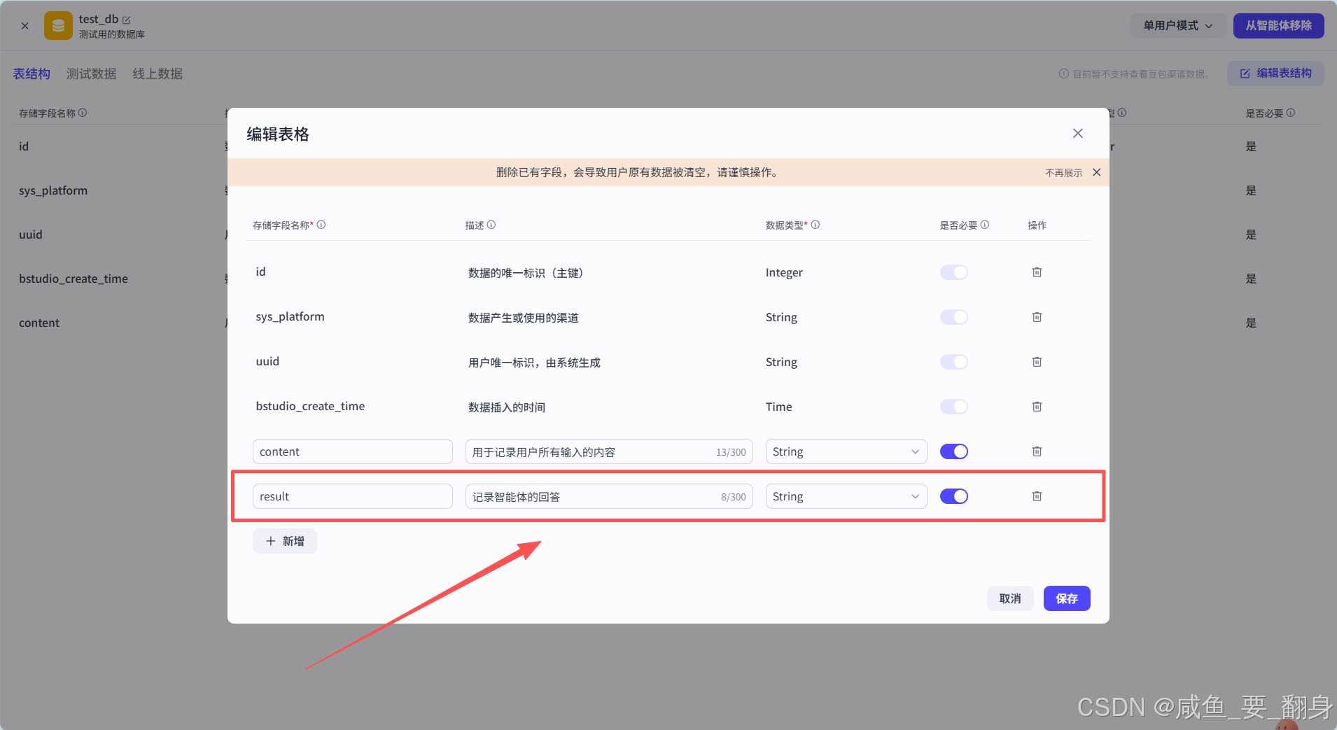 为了提高智能体的响应速度,我们可以缓存相同的提问内容及其回答。首先新增一个字段 result,用于记录智能体的回复内容,同上也要勾上必要这个选择: