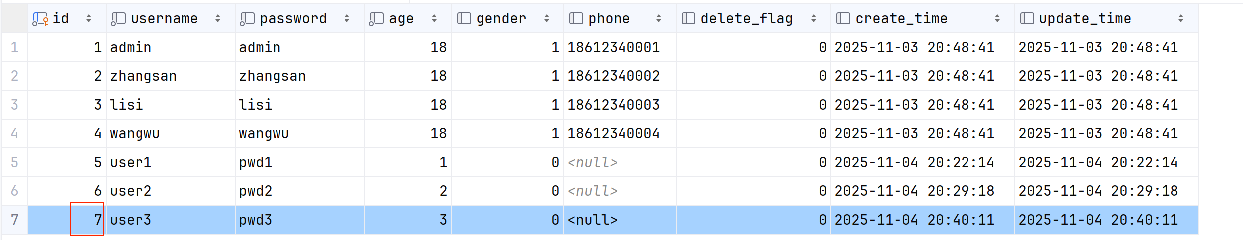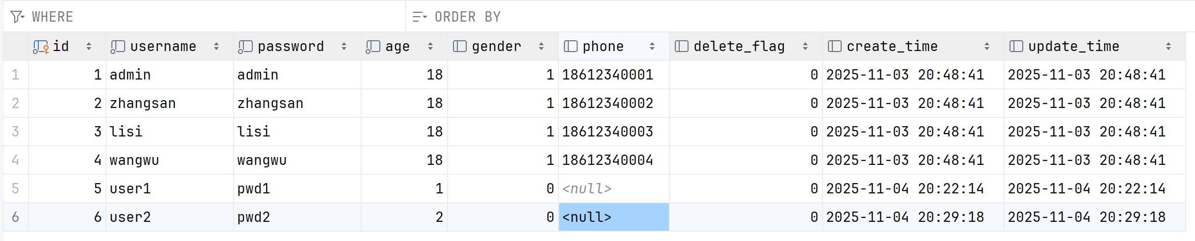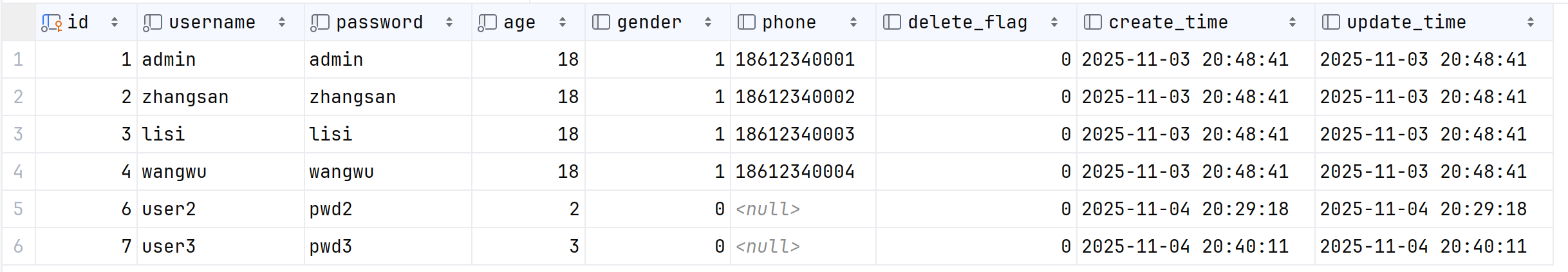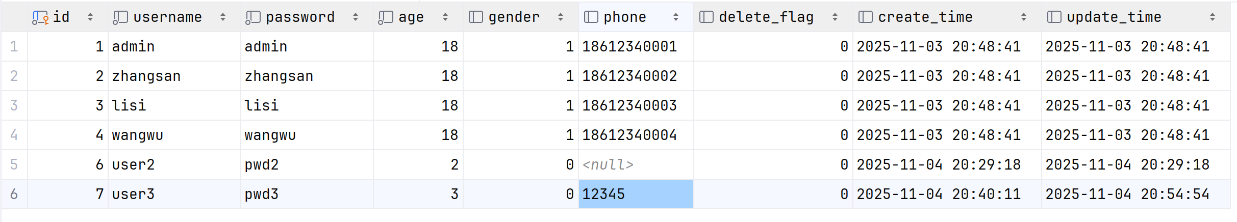 select id, username, age, gender, phone, delete_flag, create_time, update_time