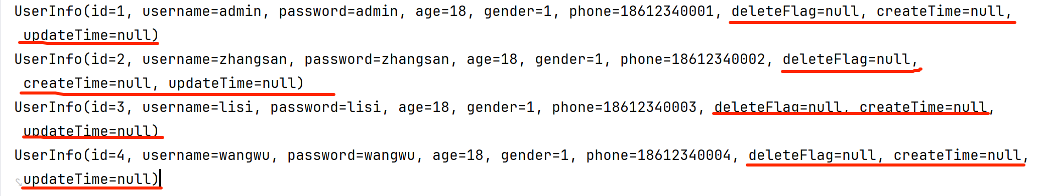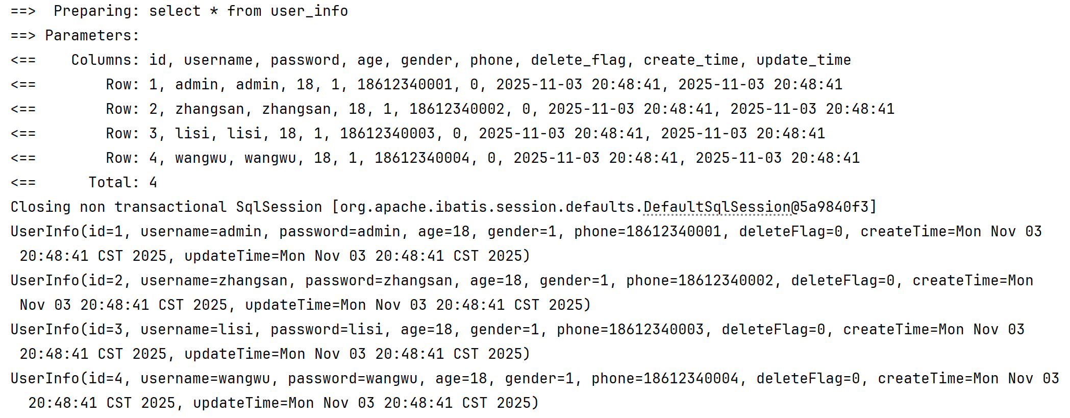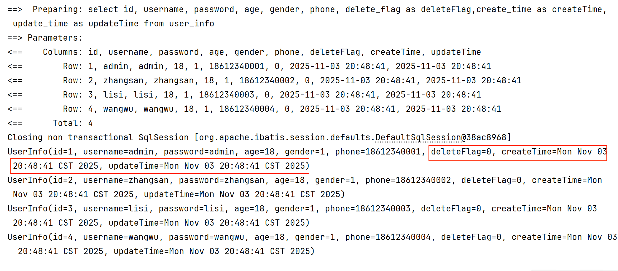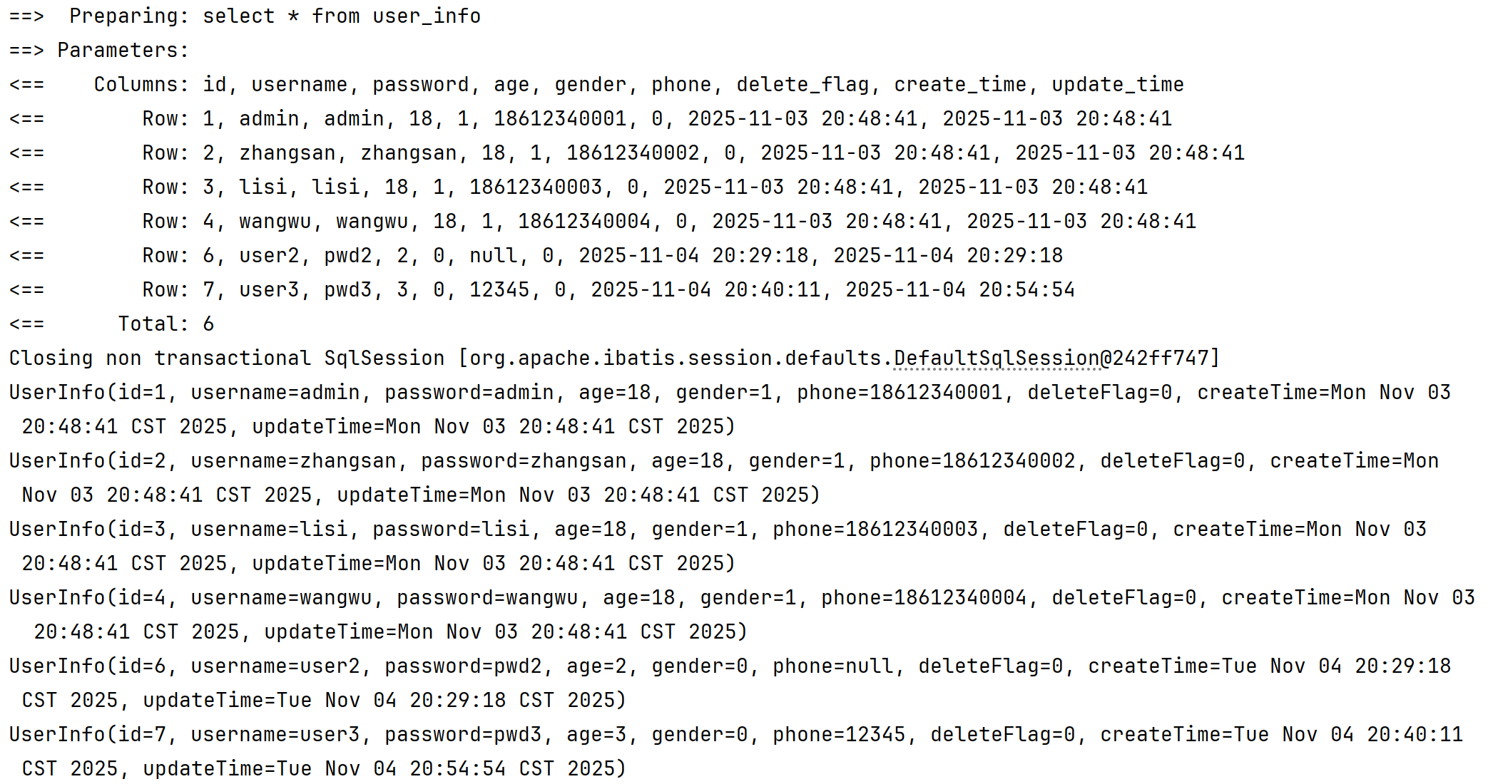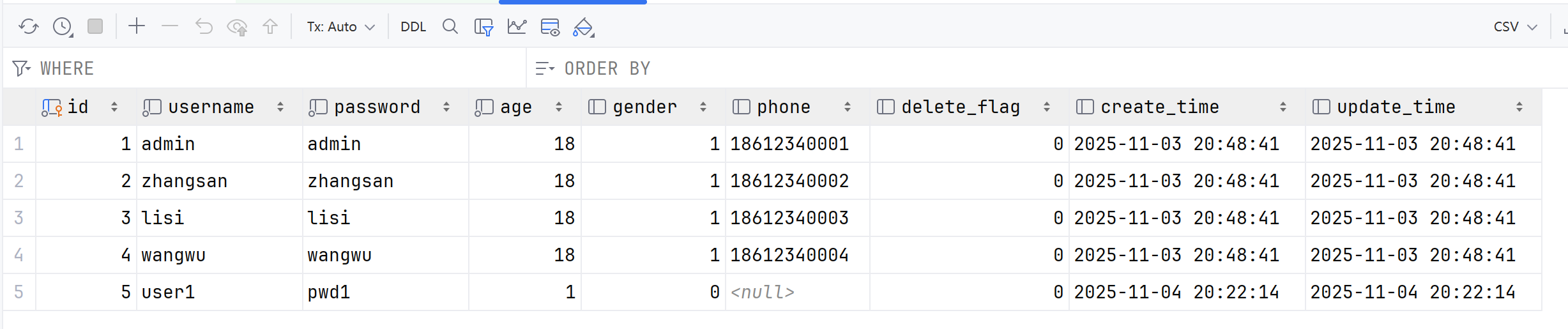 select id, username, age, gender, phone, delete_flag, create_time, update_time