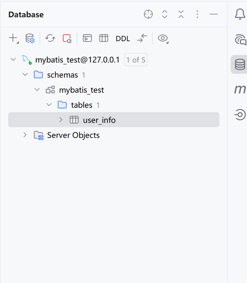 点击OK,编译器右侧工具栏的Database就会出现我们配置的MySQL,刚才新建的mybatis数据库和user_info数据表: