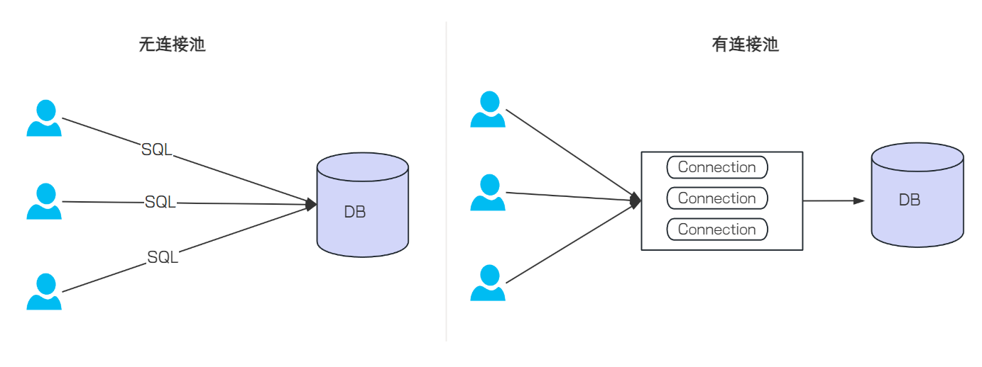 使用数据库连接池的情况:程序启动时,会在数据库连接池中创建一定数量的Connection对象,当客户请求数据库连接池,会从数据库连接池中获取Connection对象,然后执行SQL,SQL语句执行完,再把Connection归还给连接池。