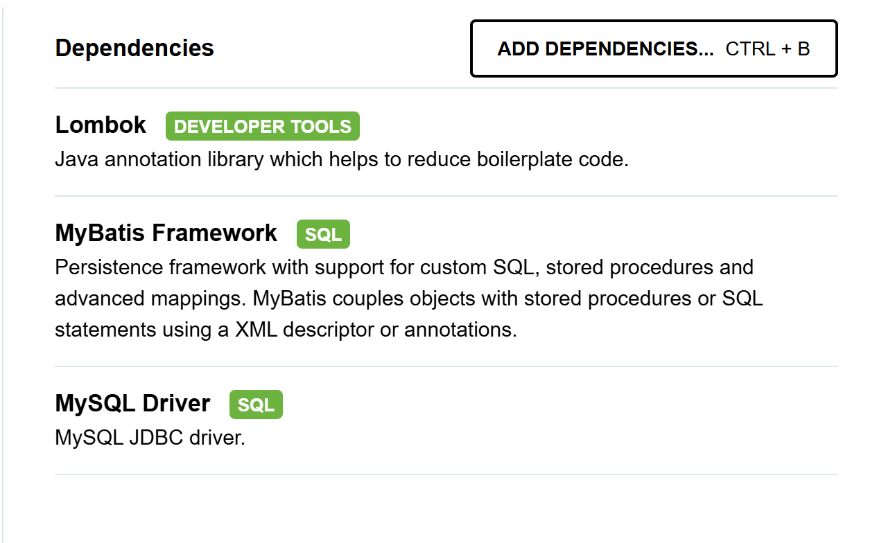 创建springboot工程,并导入mybatis的起步依赖和mysql的驱动包(Mybatis是一个持久层框架,具体的数据存储和数据操作还是在MySQL中操作的,所以需要添加MySQL驱动)。