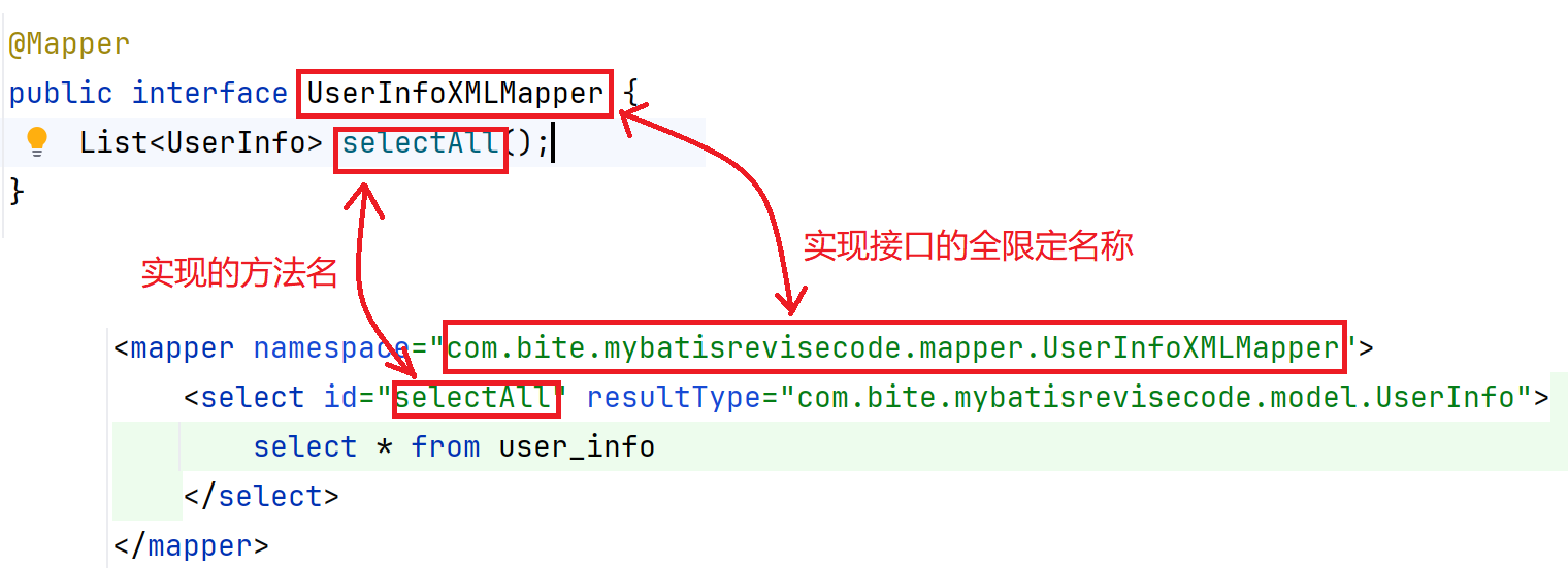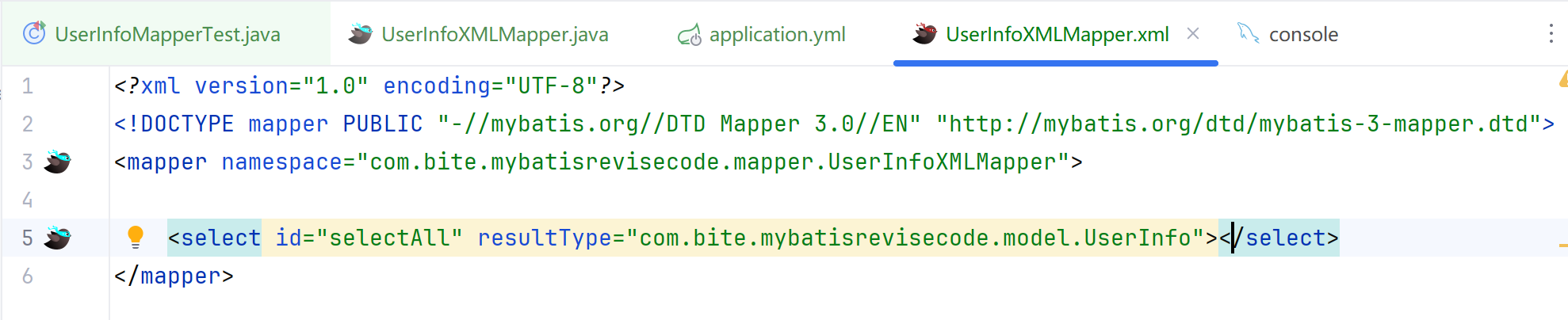 <select id="selectByCondition" resultType="com.bite.mybatisrevisecode.model.UserInfo">