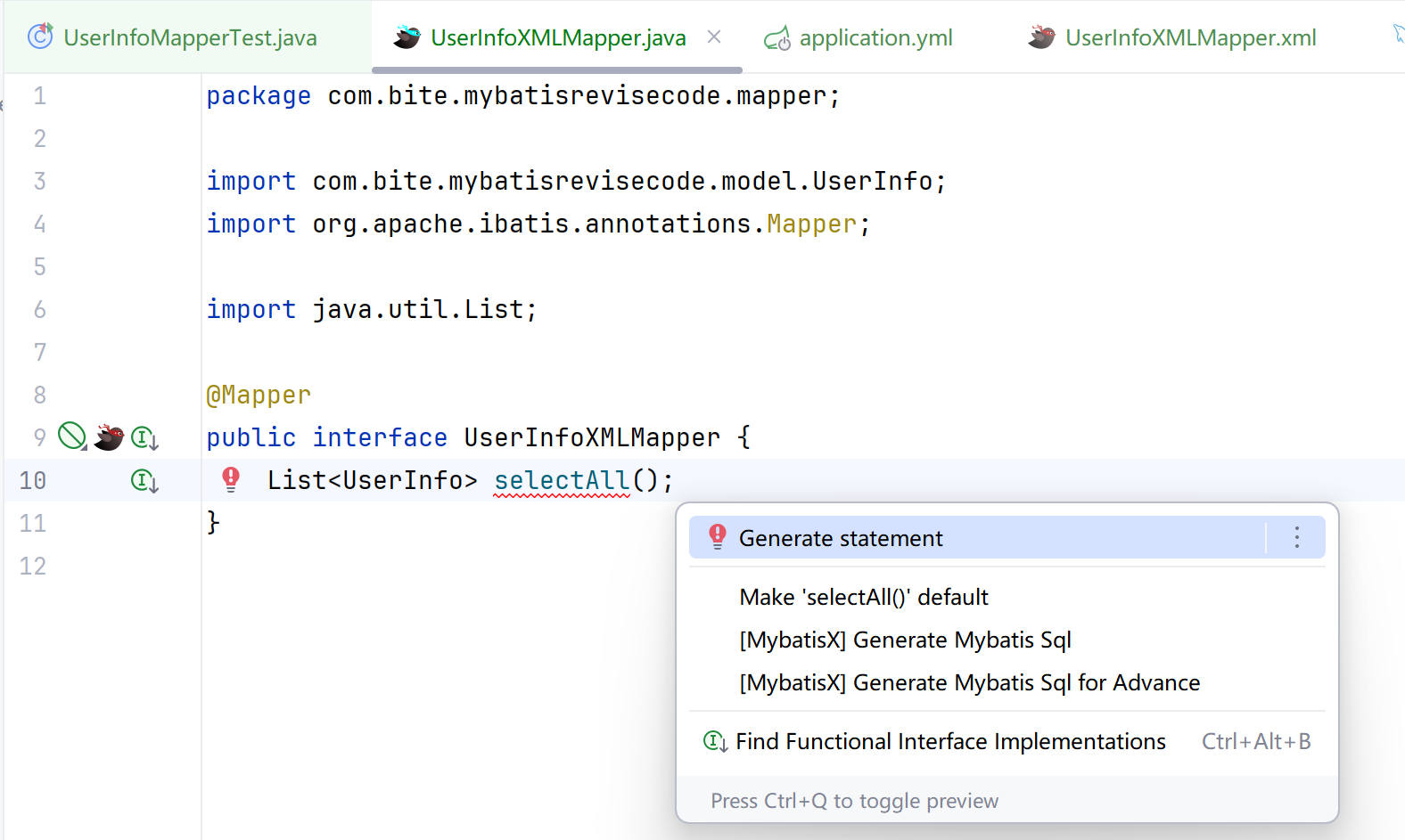 import com.bite.mybatisrevisecode.model.UserInfo;