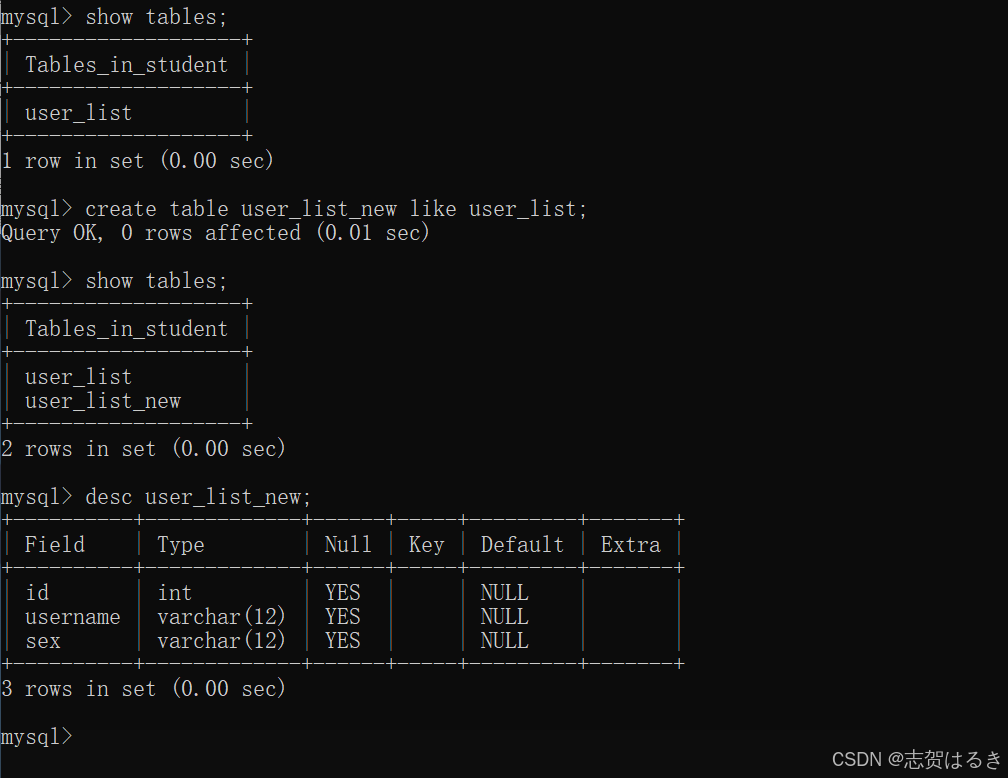 mysql> create table user_list_new like user_list; //复制user_list表但不复制数据