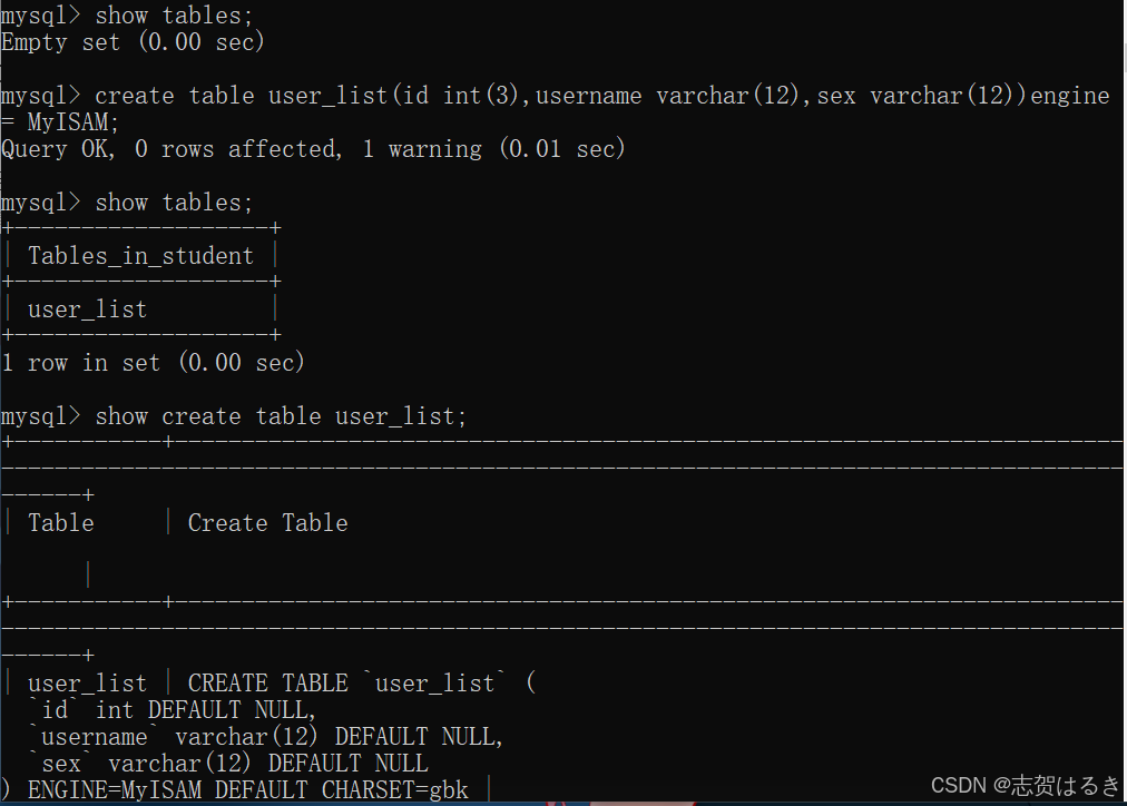 mysql> create table user_list(id int(3),username varchar(12),sex varchar(12))engine = MyISAM; //创建user_list表,且使用MySAM引擎