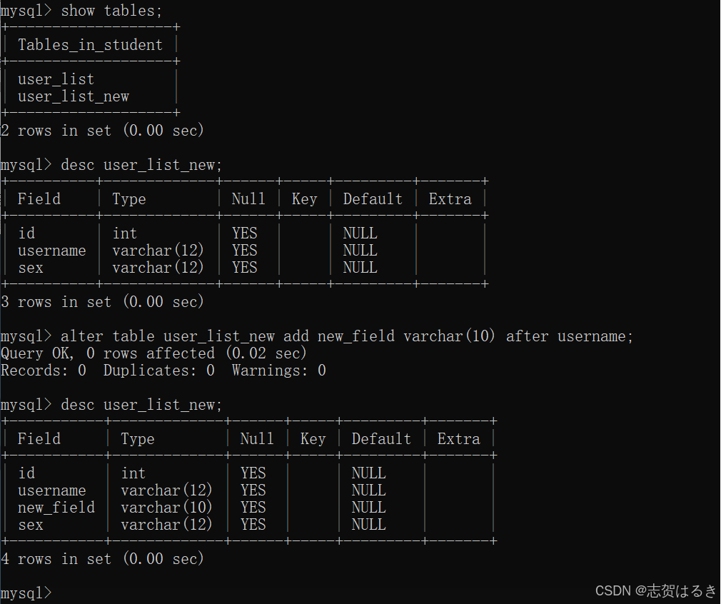 mysql> alter table user_list_new add new_field varchar(10) after username;//增加新的字段