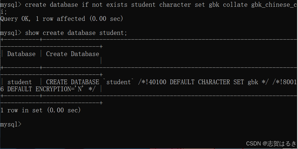 mysql> create database if not exists student character set gbk collate gbk_chinese_ci;