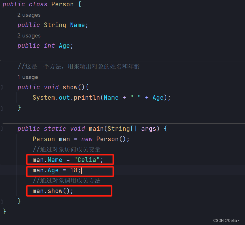 - 类中的Name与Age变量叫做字段,或者属性,或者成员变量。