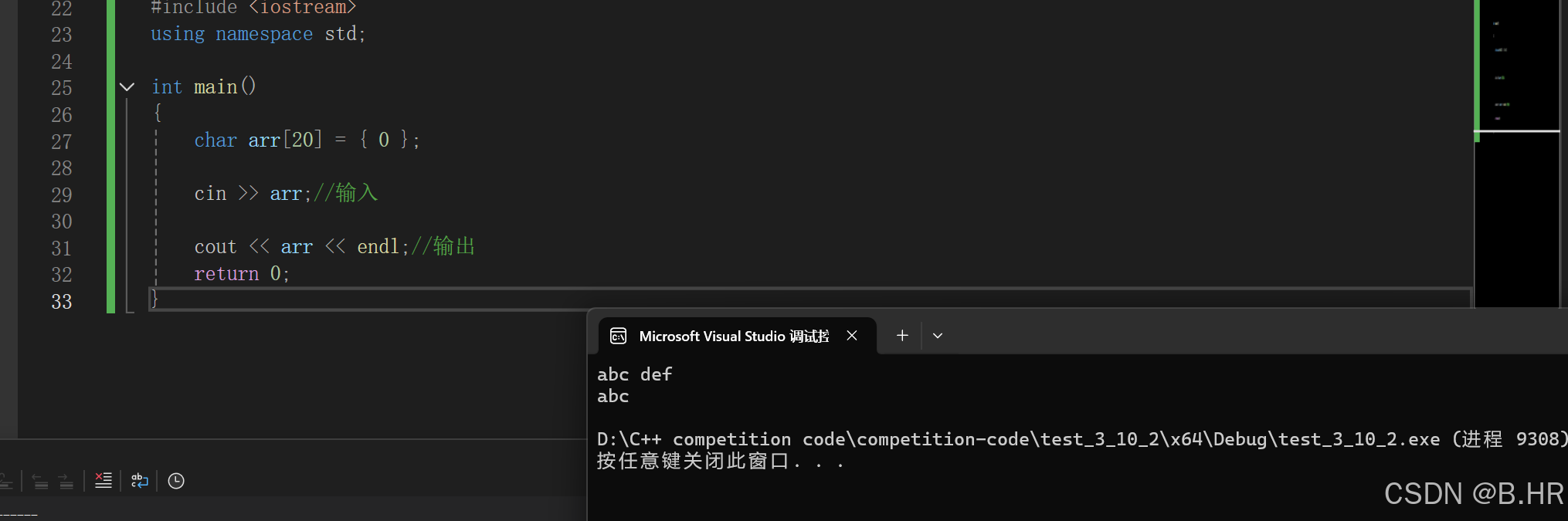 ✅其实cin在读取⼀个字符串的时候,在遇到空白字符的时候,就认为字符串结束了,不再继续往后读取剩余的字符,同时将已经读取到的字符串末尾加上\0,直接存储起来。