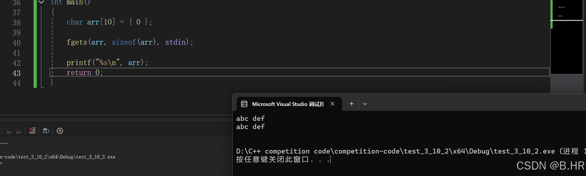 当输⼊"abcdef"的时候,实际上scanf只读取了abc就结束了,也就是相当于遇到空格就结束了。