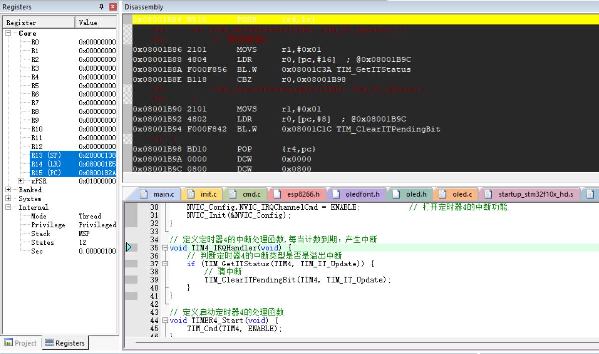 就像图中所示的 STM32 调试场景(下图):定时器中断服务函数 TIM4_IRQHandler