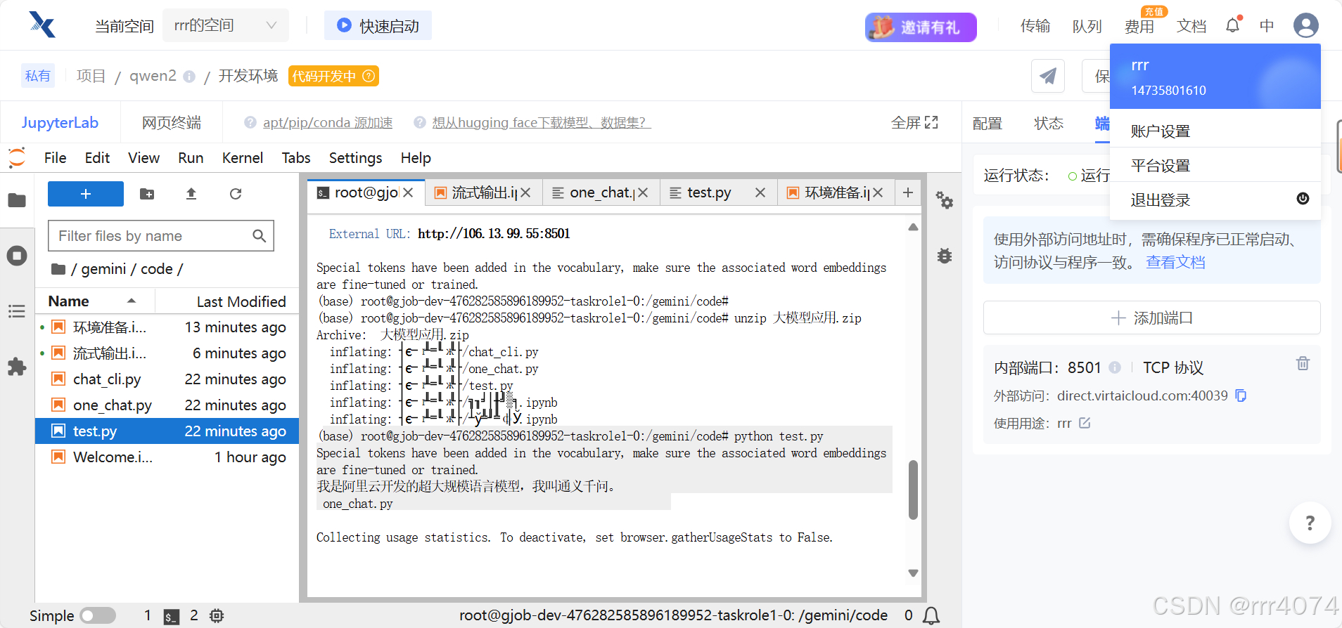 我们在本地解压大模型应用.zip,得到5个文件,进入/gemini/code目录,将文件拖入窗口完成上传