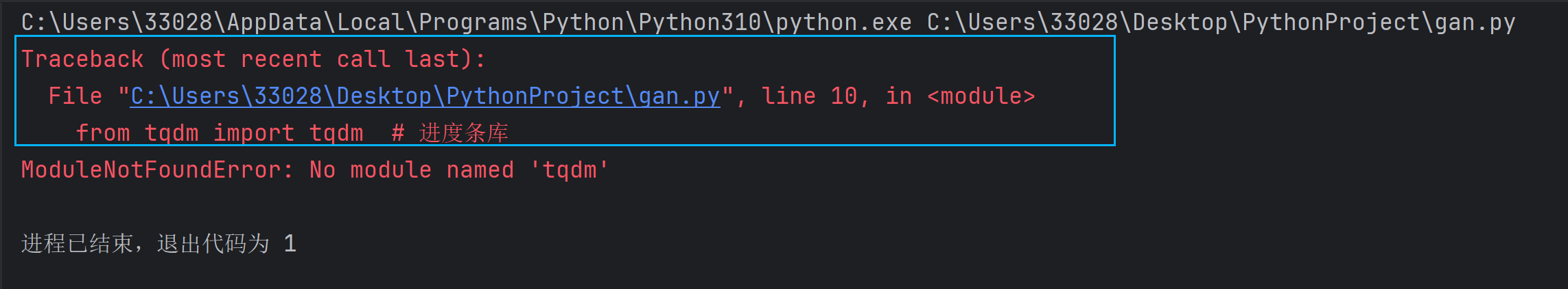 如果运行项目的源代码后,出现如下问题,表示缺少了tqdm库。