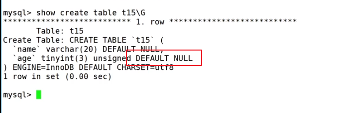 mysql> create table tt10 ( -> name varchar(20) not null, -> age tinyint unsigned default 0, -> sex char(2) default '男' -> ); Query OK, 0 rows affected (0.00 sec) mysql> desc tt10; +-------+---------------------+------+-----+---------+-------+ | Field | Type | Null | Key | Default | Extra | +-------+---------------------+------+-----+---------+-------+ | name | varchar(20) | NO | | NULL | | | age | tinyint(3) unsigned | YES | | 0 | | | sex | char(2) | YES | | 男 | | +-------+---------------------+------+-----+---------+-------+