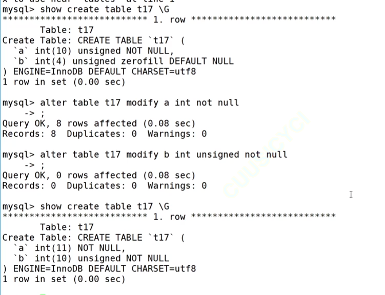 mysql> alter table tt3 change a a int(5) unsigned zerofill; mysql> show create table tt3\G *************************** 1. row *************************** Table: tt3 Create Table: CREATE TABLE `tt3` ( `a` int(5) unsigned zerofill DEFAULT NULL, --具有了zerofill `b` int(10) unsigned DEFAULT NULL ) ENGINE=MyISAM DEFAULT CHARSET=gbk 1 row in set (0.00 sec)