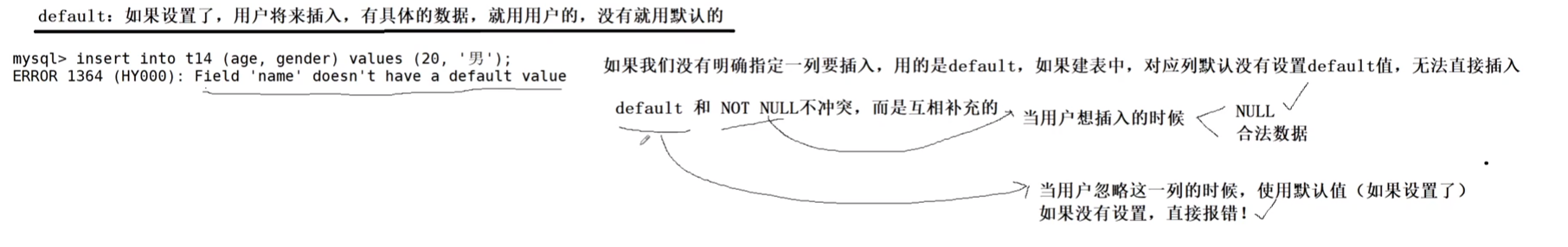 mysql> insert into tt10(name) values('zhangsan'); Query OK, 1 row affected (0.00 sec) mysql> select * from tt10; +----------+------+------+ | name | age | sex | +----------+------+------+ | zhangsan | 0 | 男 | +----------+------+------+ --注意:只有设置了default的列,才可以在插入值的时候,对列进行省略