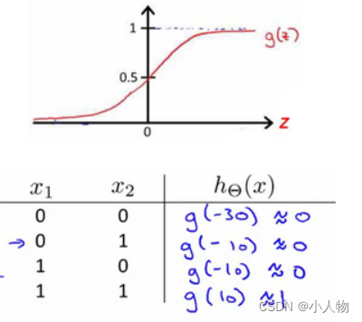 举例说明:逻辑与(AND);下图中左半部分是神经网络的设计与output层表达式,右边上部分是sigmod函数,下半部分是真值表。
